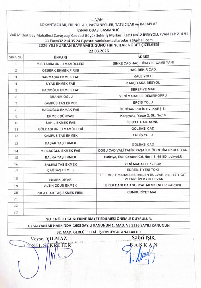 Van Lokantacılar, Fırıncılar, Pastaneciler, Tatlıcılar ve Kasaplar Esnaf Odası tarafından alınan bilgilere göre, bayram boyunca hizmet verecek ekmek fırınlarının tam listesi paylaşıldı.