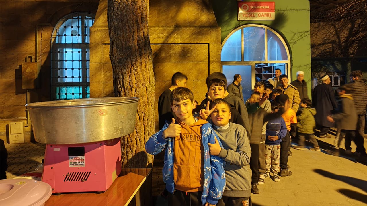 Sadece çocuklar değil, camiye gelen yetişkinler de bu güzel tabloya ortak oluyor. Pamuk şeker sırasındaki tebessümler, Ramazan’ın birlik ve beraberlik ruhunu yeniden canlandırıyor.