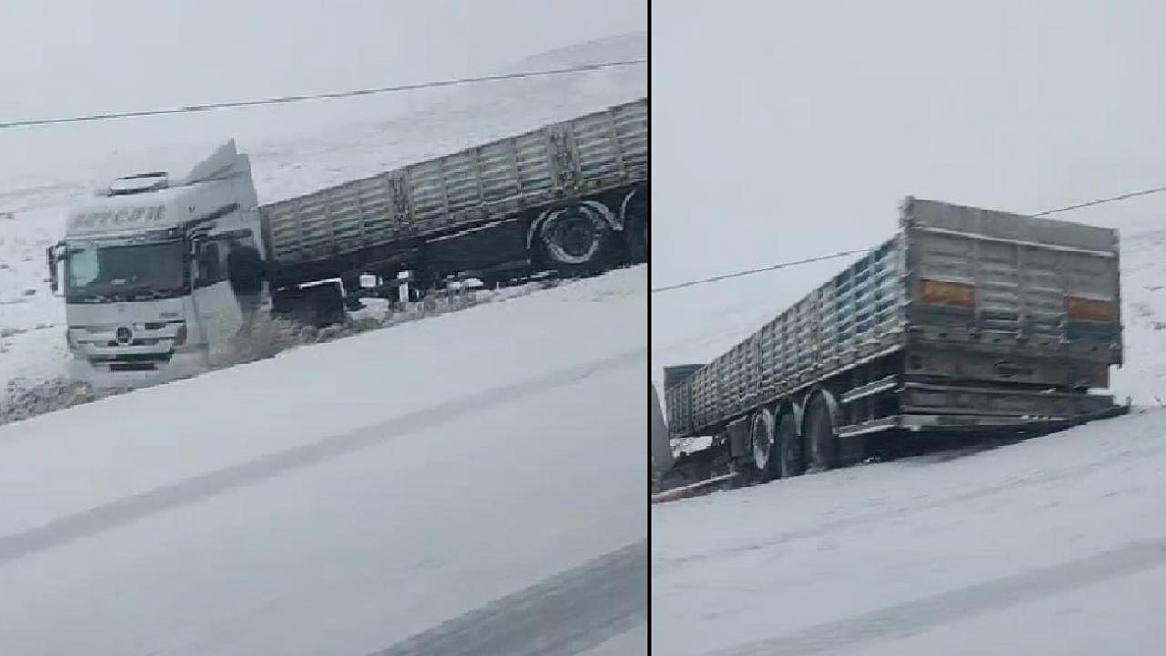 Karlı yolda ilerlemekte güçlük çeken tır, sürücüsünün kontrolünü kaybetmesiyle yoldan çıkarak tarlaya girdi.