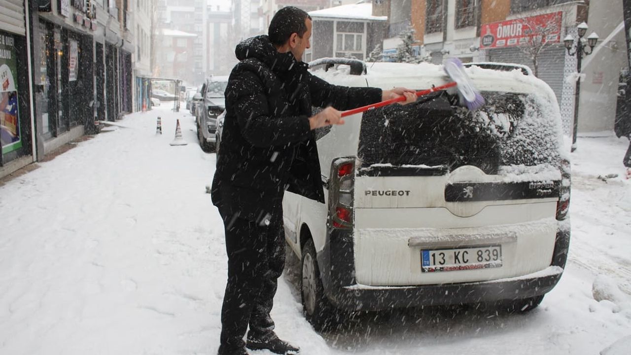 Kar nedeniyle beyaza bürünen Başkale'de vatandaşlar, iş yerlerinin önünde ve araçların üzerinde biriken karı temizledi.