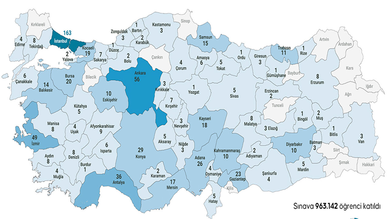 Tam puan alan öğrencilerin illere göre dağılımında ise büyük şehirler başı çekti. İstanbul 163 birinci ile zirvede yer alırken, Ankara 56, İzmir ise 49 öğrenci ile listede üst sıralarda yer aldı. Van’ın yanı sıra Zonguldak, Elazığ, Giresun, Kırıkkale, Niğde, Nevşehir, Kastamonu ve Batman da 3’er birinci çıkaran iller arasında yer aldı.