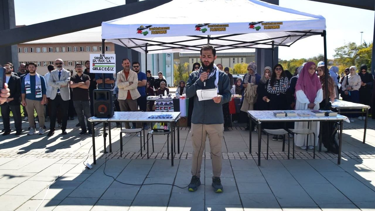 Yeni eğitim – öğretim döneminin başlamasıyla kurulan çadırın açılışını yapan öğrenci ve akademisyenler, Sumud Filosu ve Gazze’deki güncel duruma ilişkin basın açıklaması yaptı.