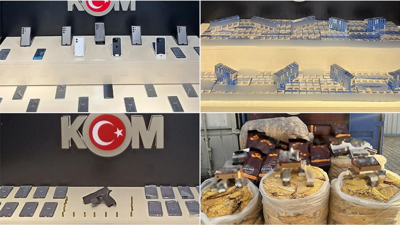 1.295 paket kaçak sigara, 46 adet kaçak cep telefonu, 45 litre kaçak alkol, 125 kg kıyılmış tütün, 460 kg yaprak tütün, 500 adet puro, 48 adet tabaka, 36 adet pipo, 96 adet sigara ağızlığı, 11.910 adet çeşitli kaçak malzeme ele geçirildi.