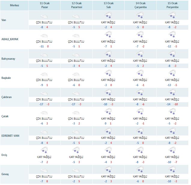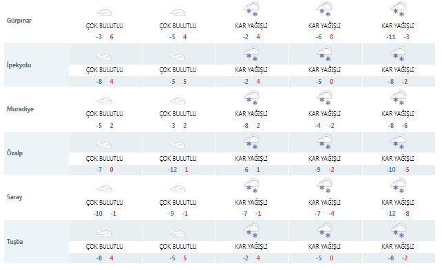Meteoroloji 14. Bölge Müdürlüğü, verilerine göre, Bölge genelinde havanın çok bulutlu, Muş ve Bitlis illeri ile Van çevresinde aralıklı kar yağışlı olması beklenmektedir.Hava sıcaklıklarının mevsim normalleri civarında seyredeceği tahmin edilmektedir.Rüzgarın doğulu ve güneyli yönlerden orta, zaman zaman sert rüzgar şeklinde esmesi beklenmektedir.