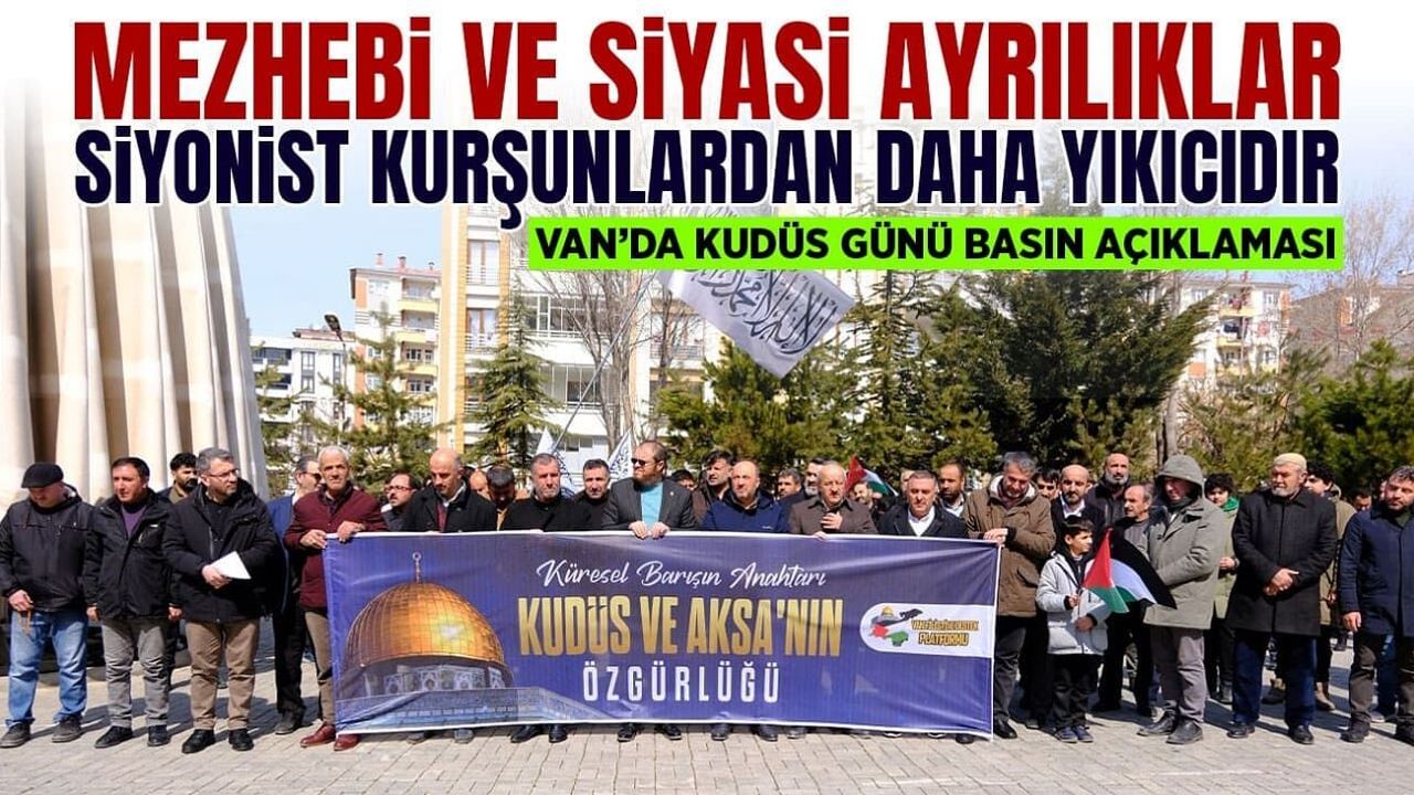 “İşte bu nedenle bugün buradan bir kez daha ilan ediyoruz: Kudüs’ün özgürlüğü yalnızca Filistin’in meselesi değil, insanlığın ortak barış meselesidir. Mescid-i Aksa’nın özgürlüğü yalnızca Müslümanların meselesi değil, insanlık onurunun ve uluslararası adaletin meselesidir. Bizler inanıyoruz ki; Kudüs’te zülüm bittiğinde, Mescid-i Aksa özgürlüğüne kavuştuğunda, Filistin halkı kendi topraklarında özgürce yaşayabildiğinde; yalnızca Ortadoğu’da değil, dünya genelinde barışın önü açılacaktır. Bu nedenle bugün Dünya Kudüs Günü vesilesiyle çağrımız şudur: Kudüs özgür olmalıdır. Mescid-i Aksa özgür olmalıdır. Filistin özgür olmalıdır. Çünkü biliyoruz ki; Küresel barışın anahtarı Kudüs ve Aksa’nın özgürlüğünden geçmektedir. Van Filistine Destek Platformu olarak diyoruz ki; Kudüs sadece bir şehir değil, bir imandır; Mescid-i Aksa sadece bir cami değil, bir davadır. Siyonizm ve emperyalizmin bu topraklardan sökülüp atılması için tek çare, ümmetin vahdetidir. Bizler, haksızlık karşısında susan dilsiz şeytanlar olmayacağız! Kudüs’ün özgürlüğü, insanlığın özgürlüğüdür. Siyonist işgal ve onun İngiliz-Amerikan destekli ortakları, tarihin çöplüğüne gömülene dek mücadelemiz sürecektir. Zulüm ilelebet devam etmez, zalimlerin sonu yakındır inşallah.”