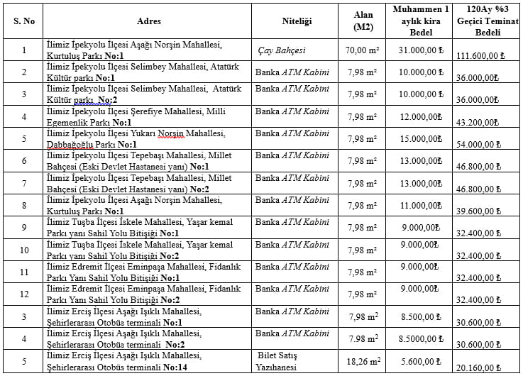 Çay bahçesi için 31.000 TL muhammen aylık kira bedeli belirlenirken, ATM kabinleri için 8.500 TL ile 15.000 TL arasında, bilet satış yazıhanesi için 5.600 TL olarak belirlendi. Geçici teminat bedelleri ise 120 aylık kira bedeli üzerinden %3 oranında hesaplandı.