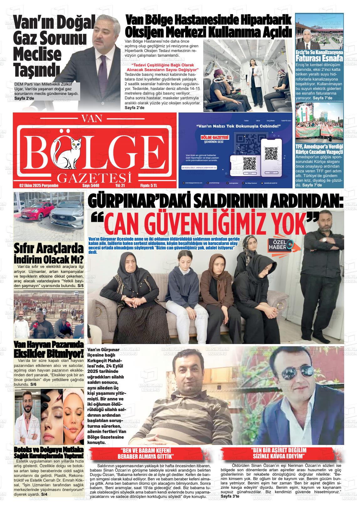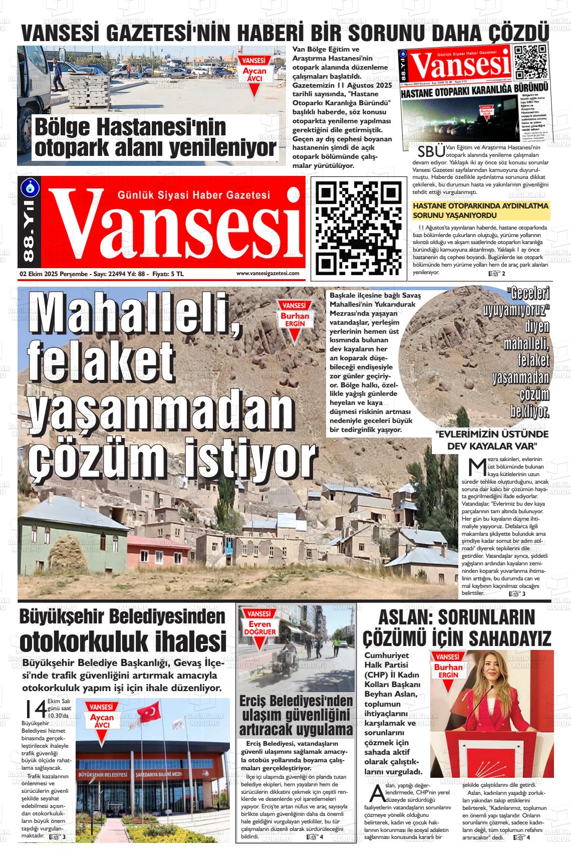 Vansesi Gazetesi’nin 02 Ekim Perşembe 2025 tarihli manşeti;