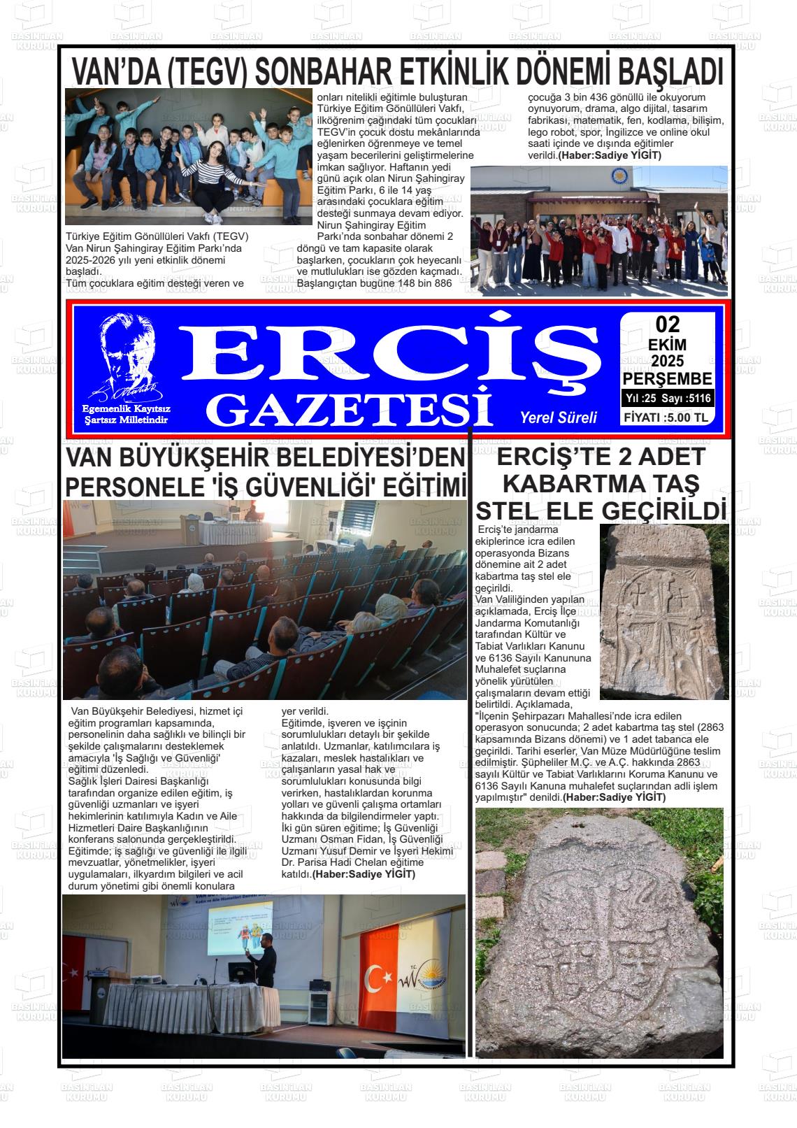 Erciş Gazetesi’nin 02 Ekim Perşembe 2025 tarihli manşeti;