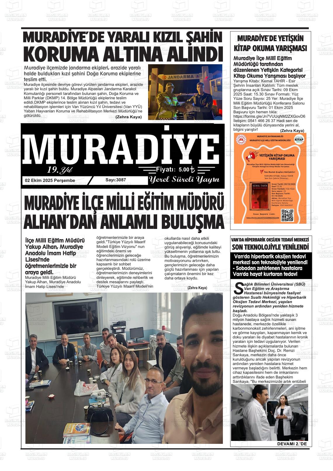 Muradiye Gazetesi’nin 02 Ekim Perşembe 2025 tarihli manşeti;