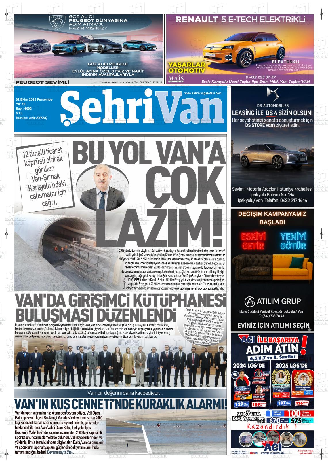 Şehrivan Gazetesi’nin 02 Ekim Perşembe 2025 tarihli manşeti;