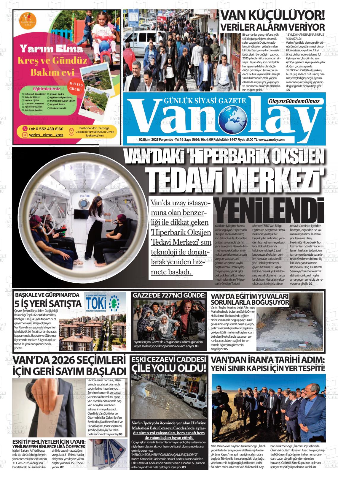 Van Olay Gazetesi’nin 02 Ekim Perşembe 2025 tarihli manşeti;
