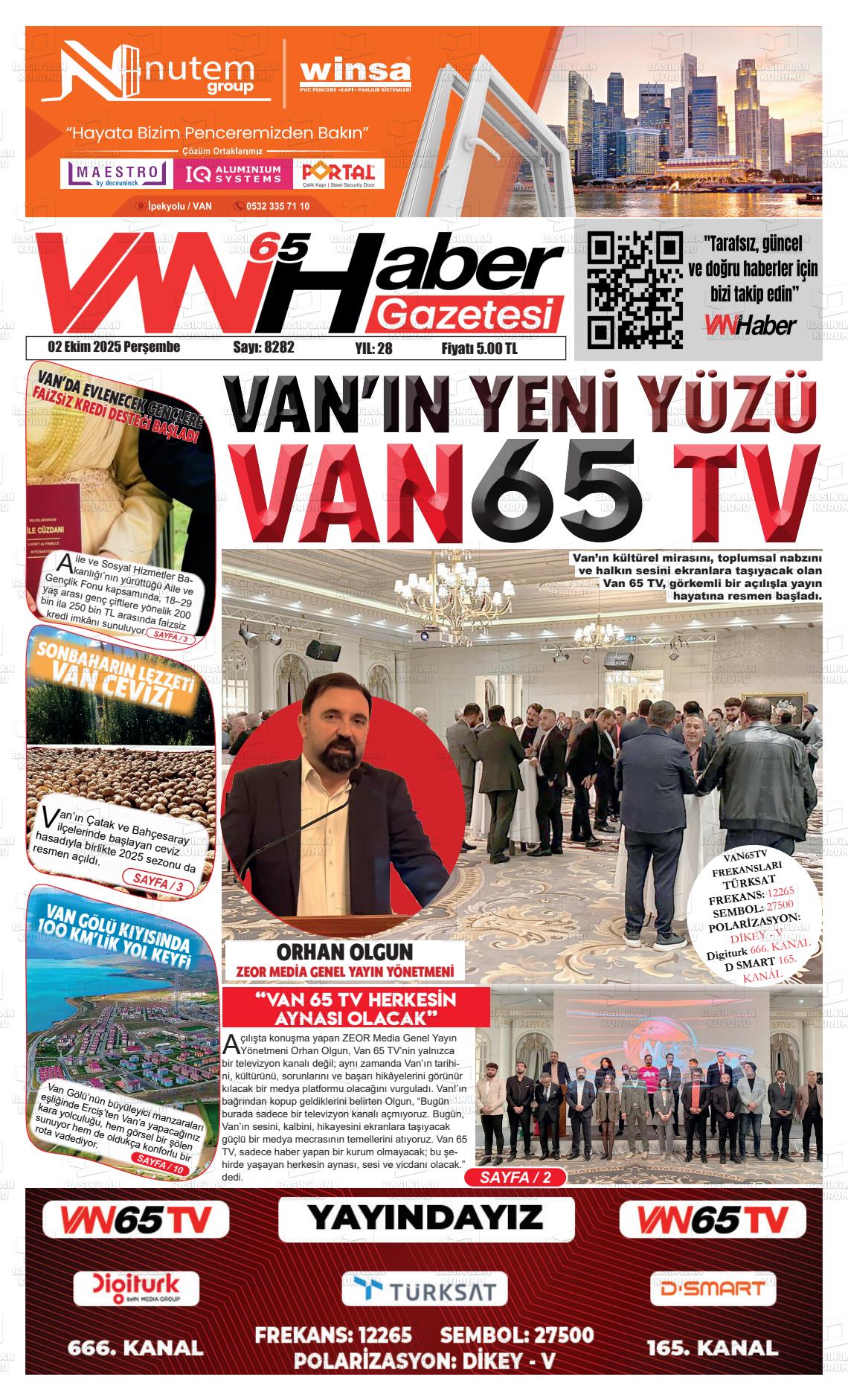 Van65 Haber Gazetesi’nin 02 Ekim Perşembe 2025 tarihli manşeti;