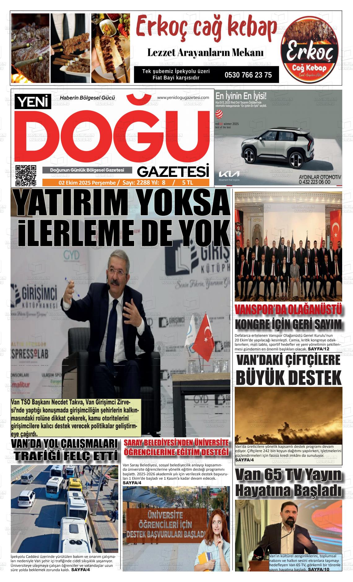 Yeni Doğu Gazetesi’nin 02 Ekim Perşembe 2025 tarihli manşeti;