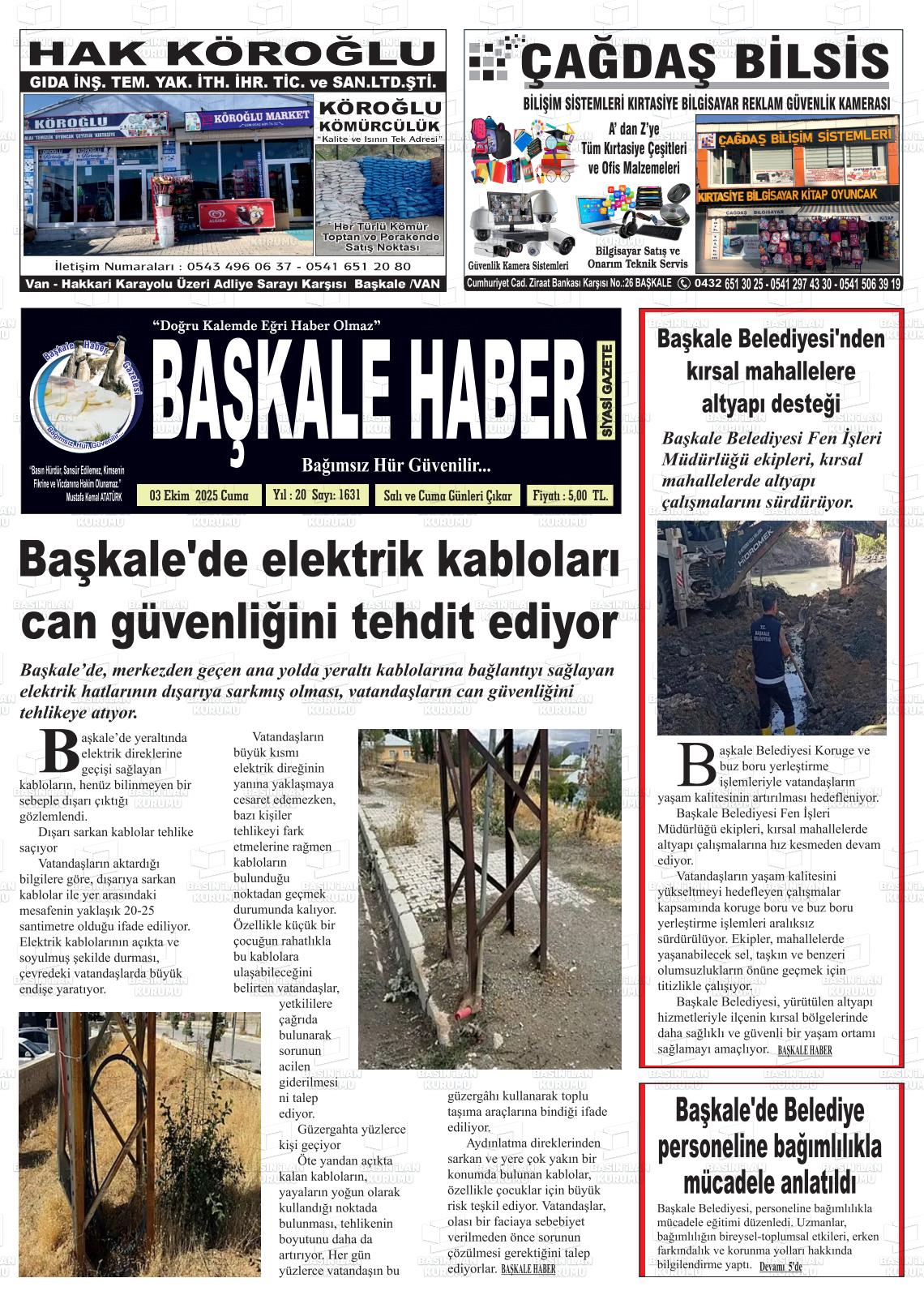 Başkale Gazetesi’nin 03 Ekim Cuma 2025 tarihli manşeti;