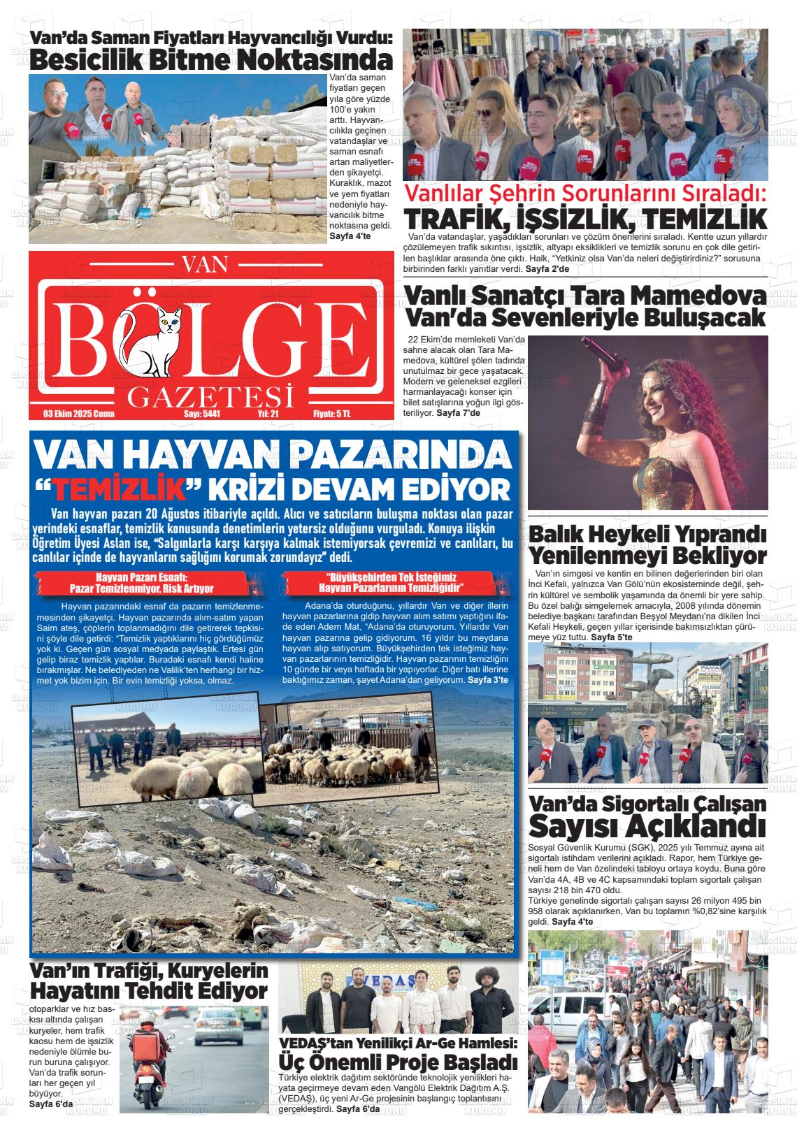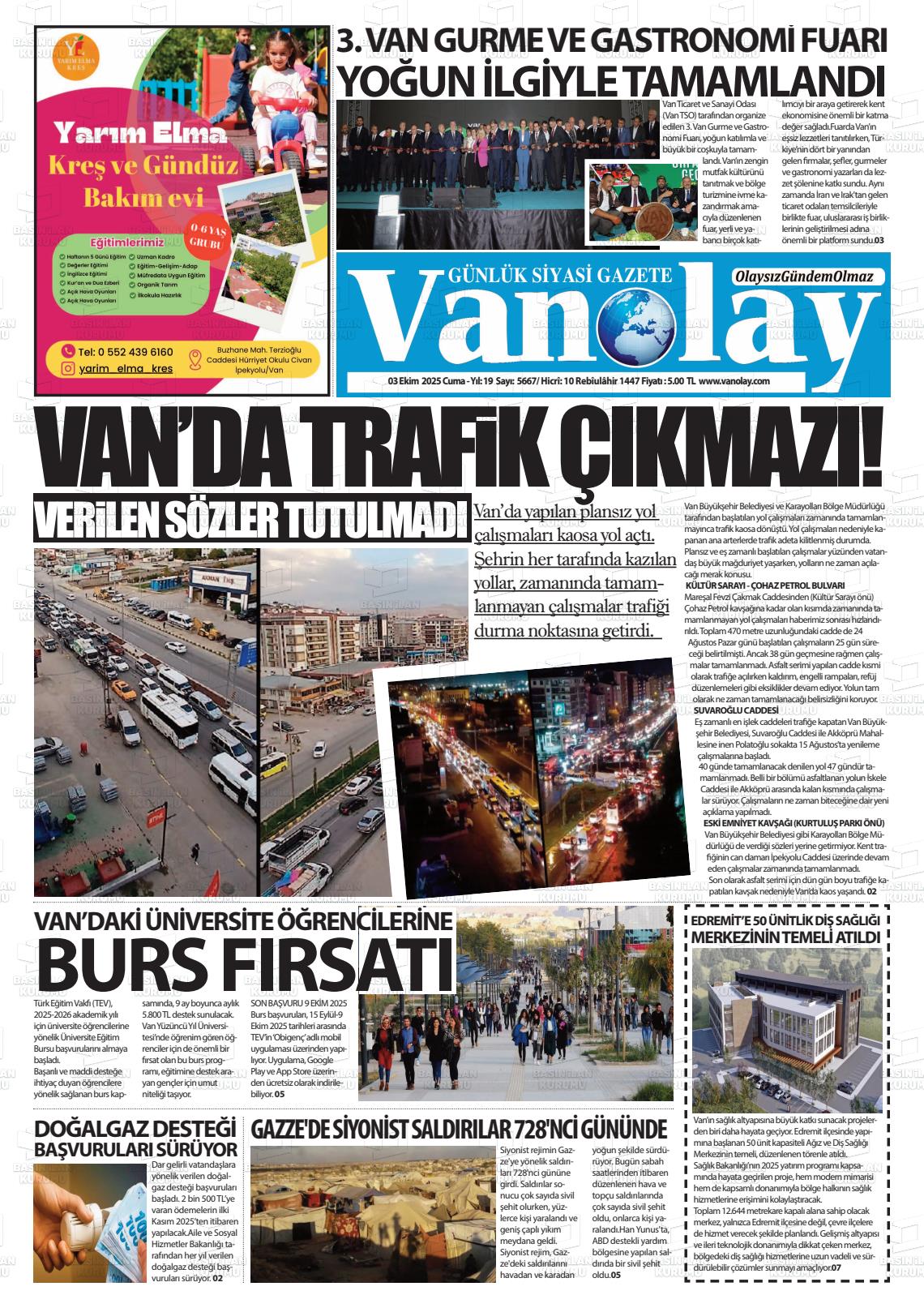 Van Olay Gazetesi’nin 03 Ekim Cuma 2025 tarihli manşeti;
