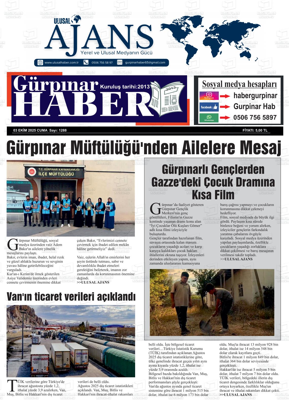 Gürpınar Haber Gazetesi’nin 03 Ekim Cuma 2025 tarihli manşeti;