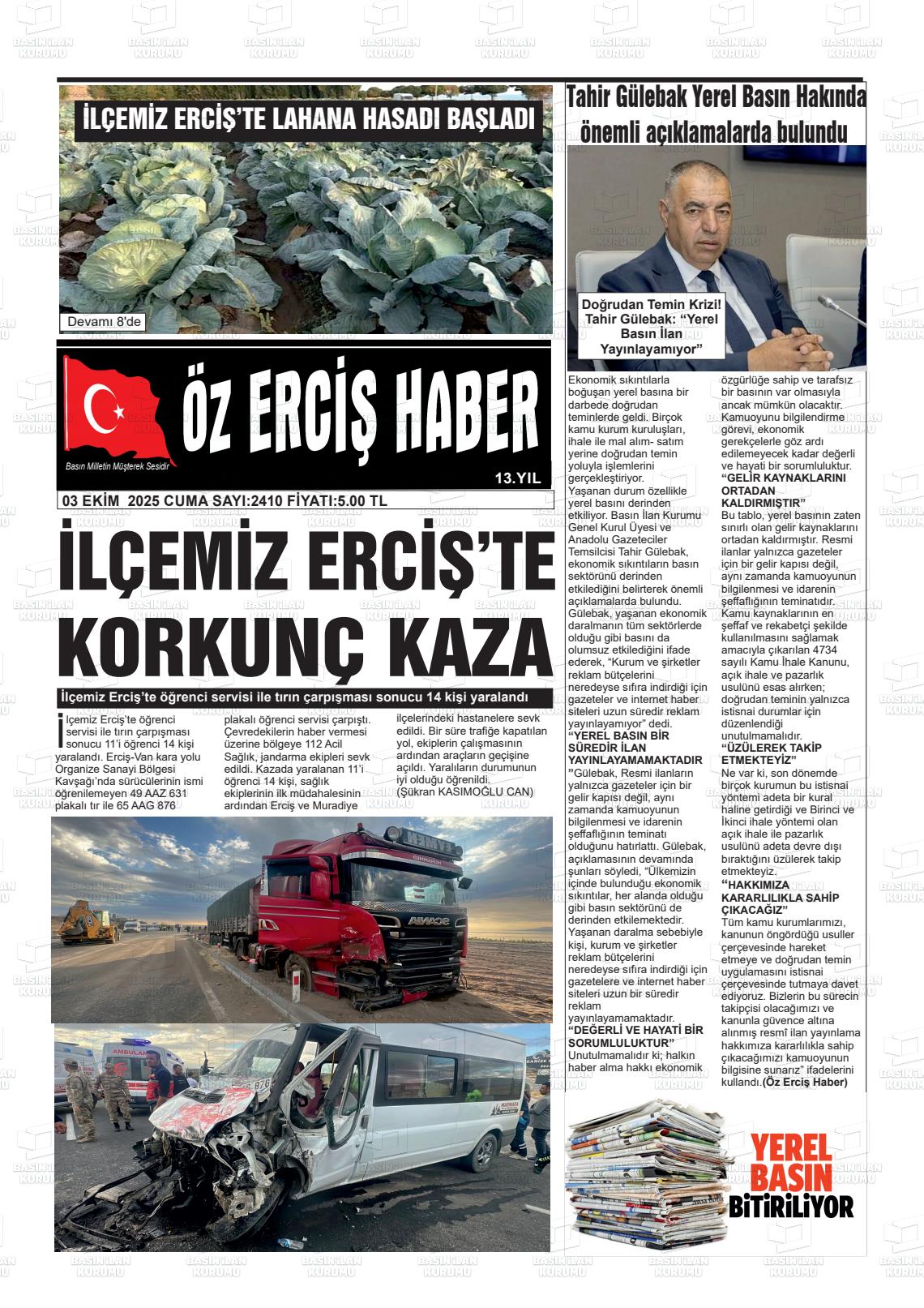 Erciş Gazetesi’nin 03 Ekim Cuma 2025 tarihli manşeti;