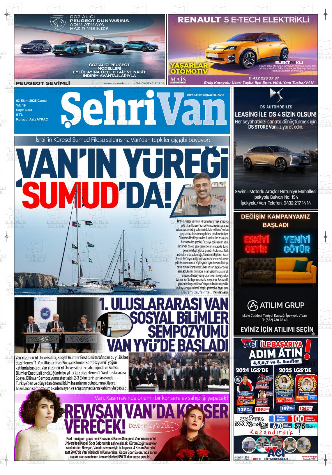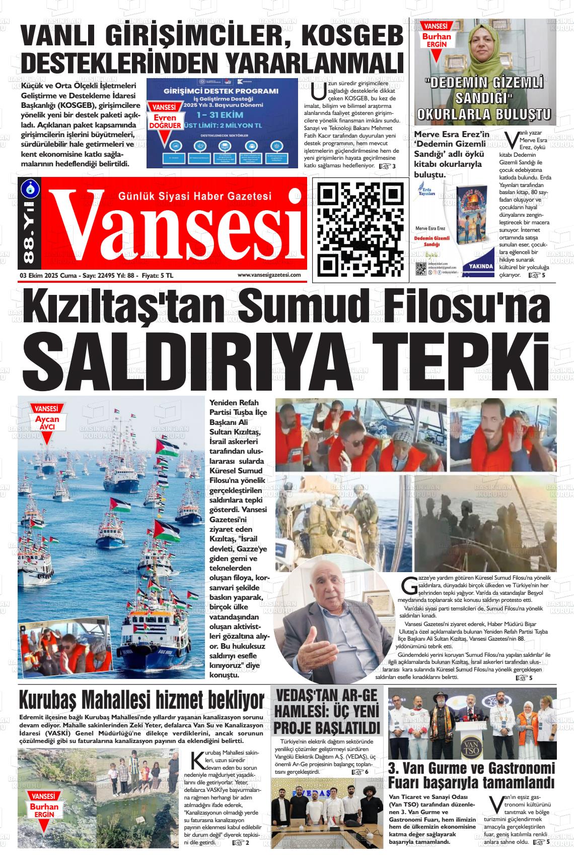 Vansesi Gazetesi’nin 03 Ekim Cuma 2025 tarihli manşeti;