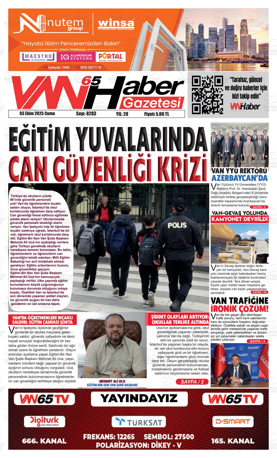 Van65 Haber Gazetesi’nin03 Ekim Cuma 2025 tarihli manşeti;