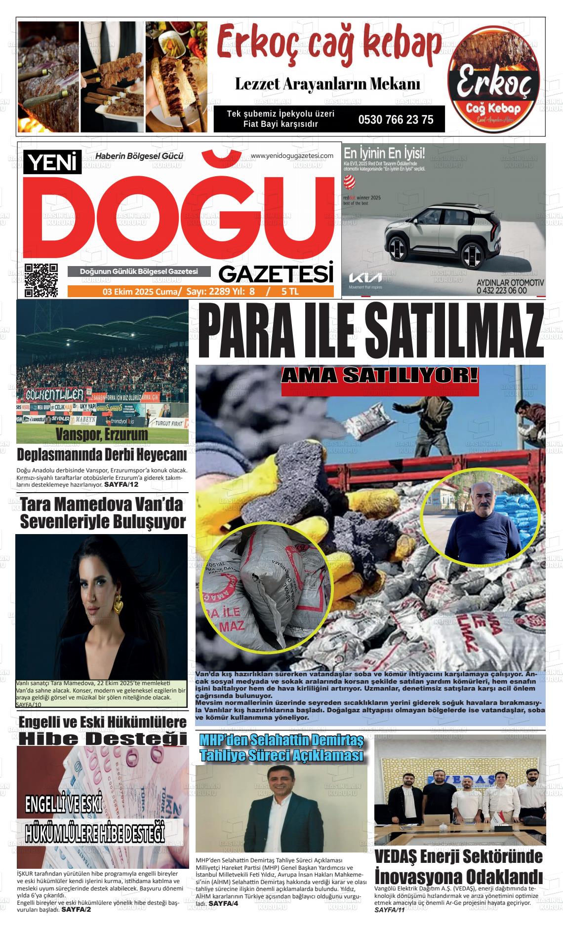 Yeni Doğu Gazetesi’nin 03 Ekim Cuma 2025 tarihli manşeti;