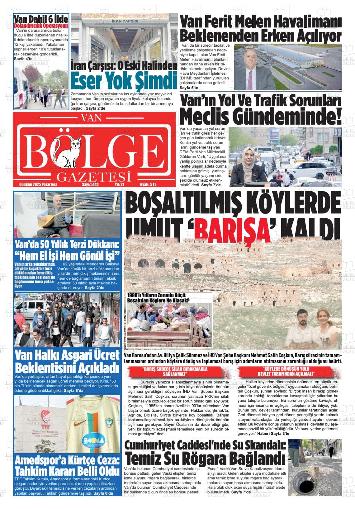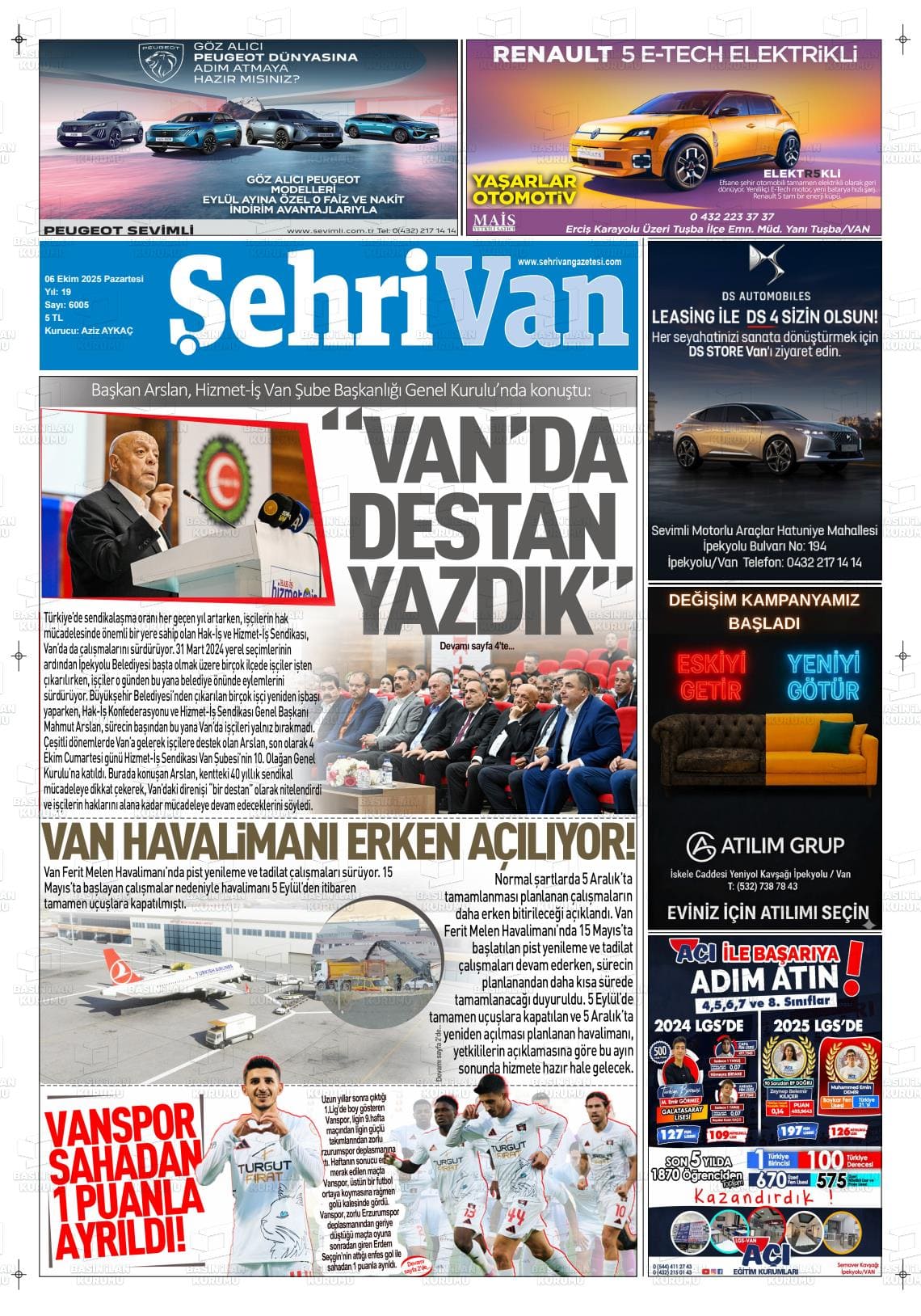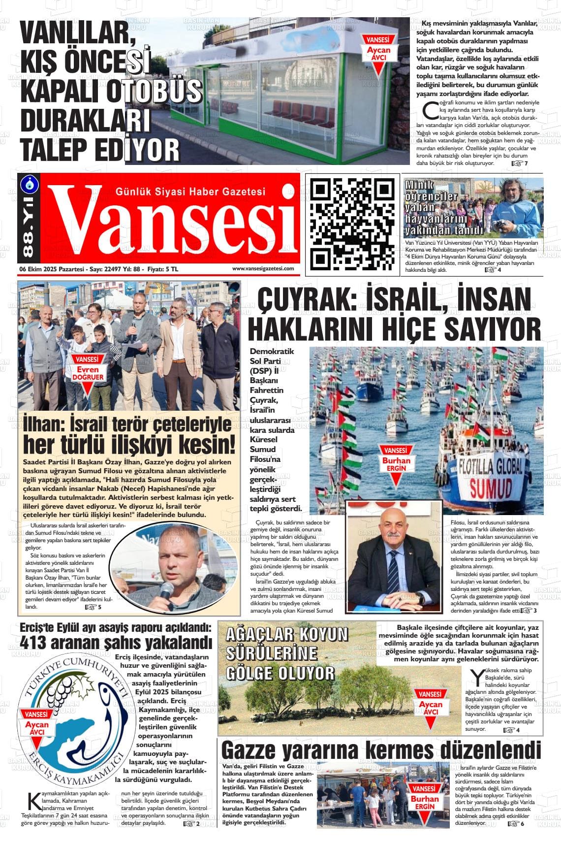 Vansesi Gazetesi’nin 06 Ekim Pazartesi 2025 tarihli manşeti;