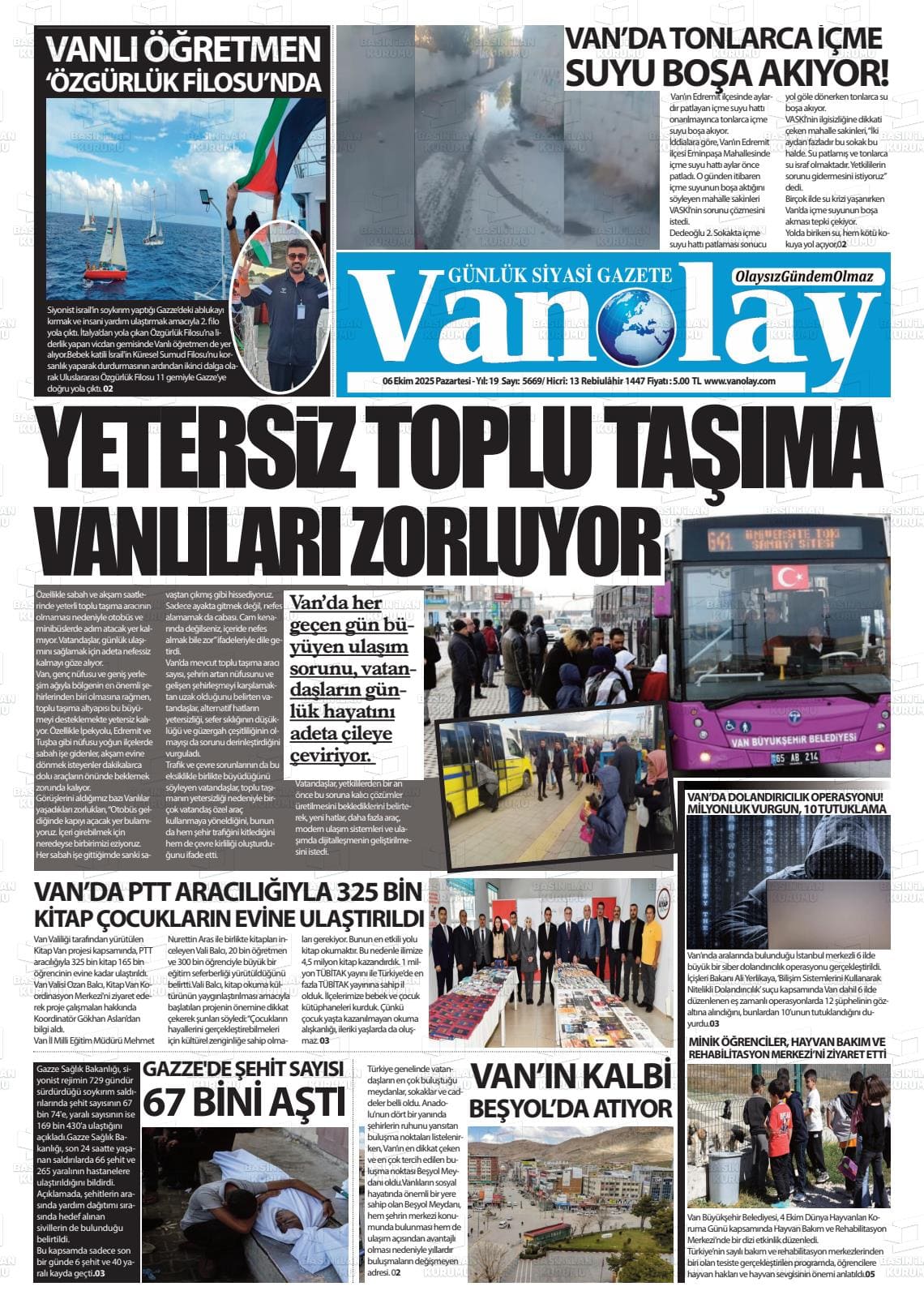 Van Olay Gazetesi’nin 06 Ekim Pazartesi 2025 tarihli manşeti;