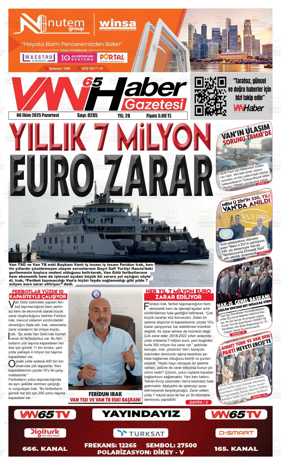 Van65 Haber Gazetesi’nin06 Ekim Pazartesi 2025 tarihli manşeti;