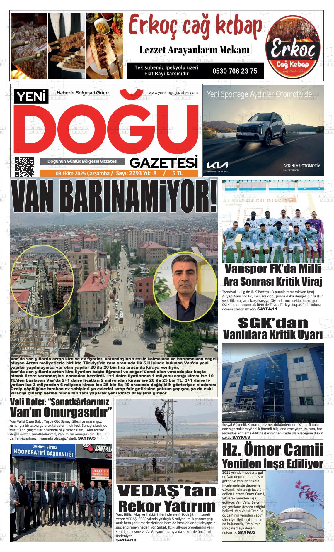 Yeni Doğu Gazetesi’nin 08 Ekim Çarşamba 2025 tarihli manşeti;