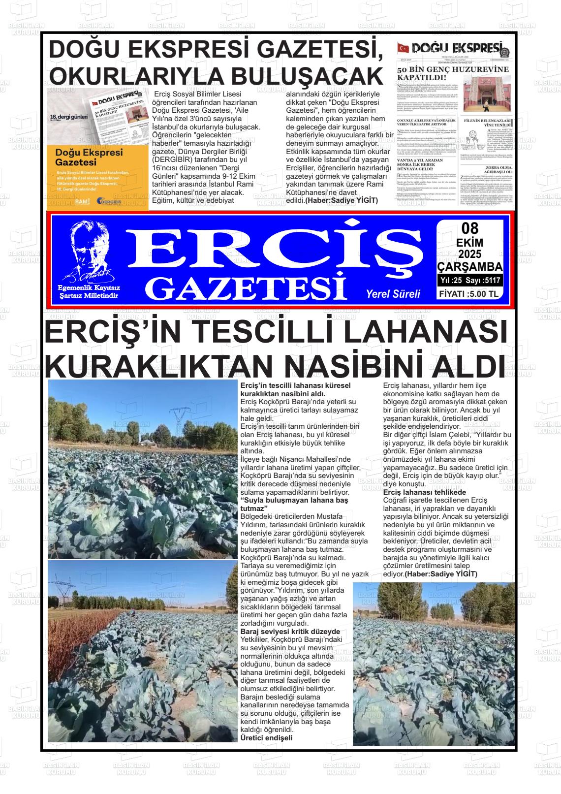 Erciş Gazetesi’nin 08 Ekim Çarşamba 2025 tarihli manşeti;