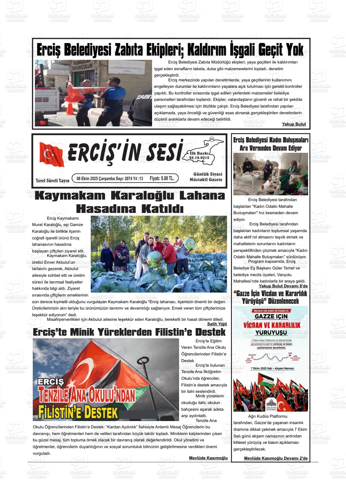 Erciş Sesi Gazetesi’nin 08 Ekim Çarşamba 2025 tarihli manşeti;