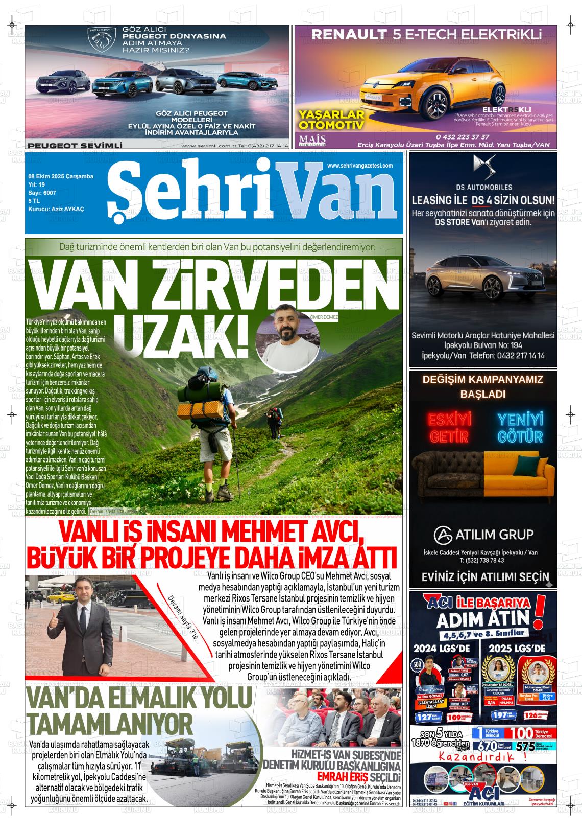 Şehrivan Gazetesi’nin 08 Ekim Çarşamba 2025 tarihli manşeti;