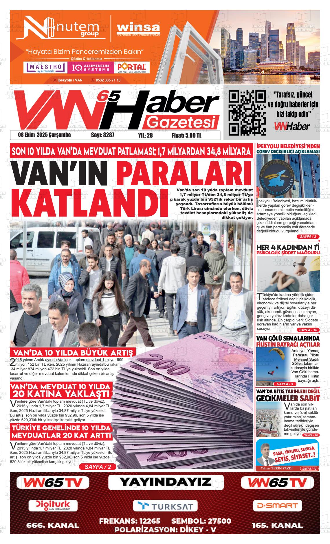 Van65 Haber Gazetesi’nin08 Ekim Çarşamba 2025 tarihli manşeti;