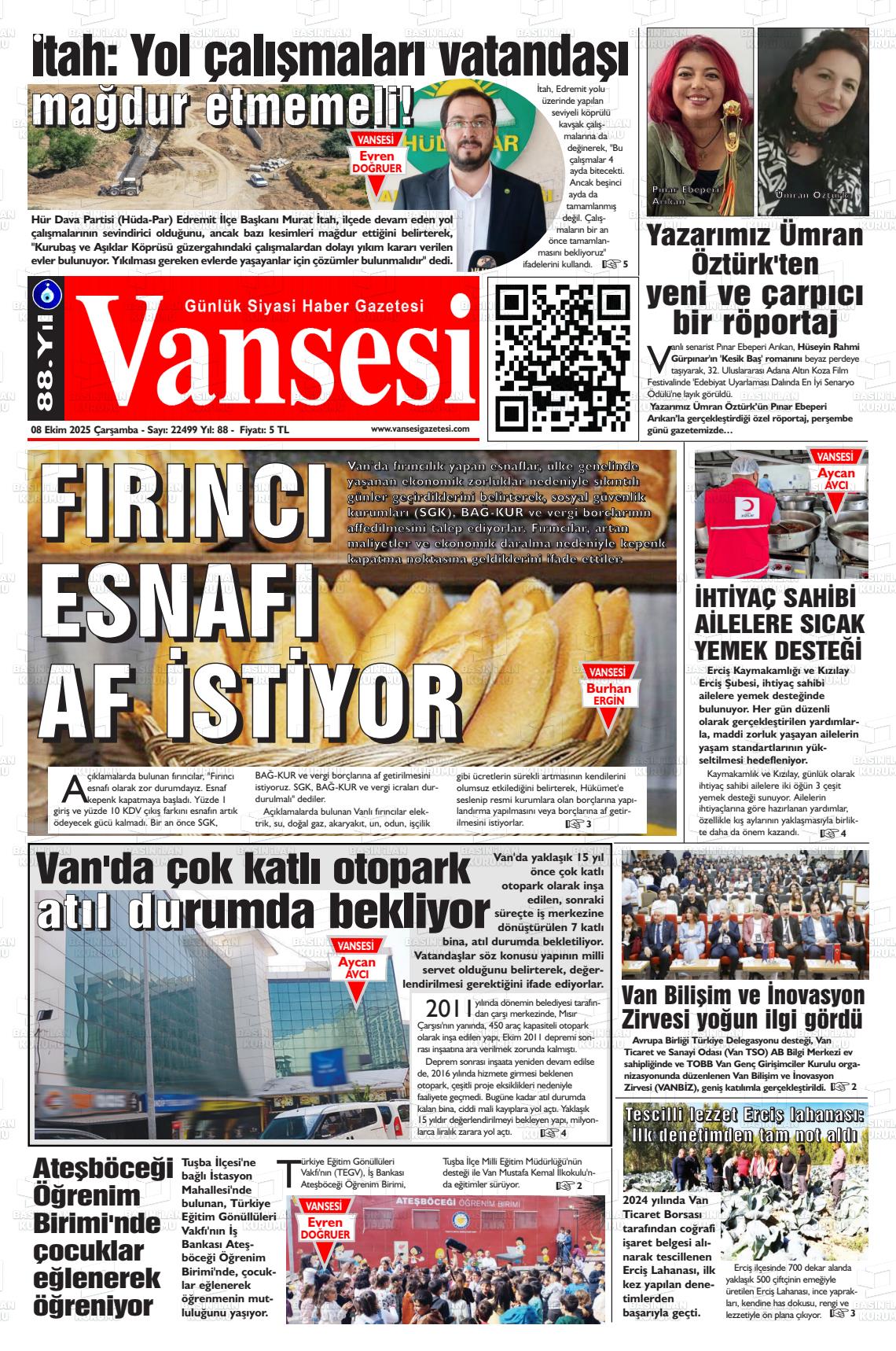 Vansesi Gazetesi’nin 08 Ekim Çarşamba 2025 tarihli manşeti;