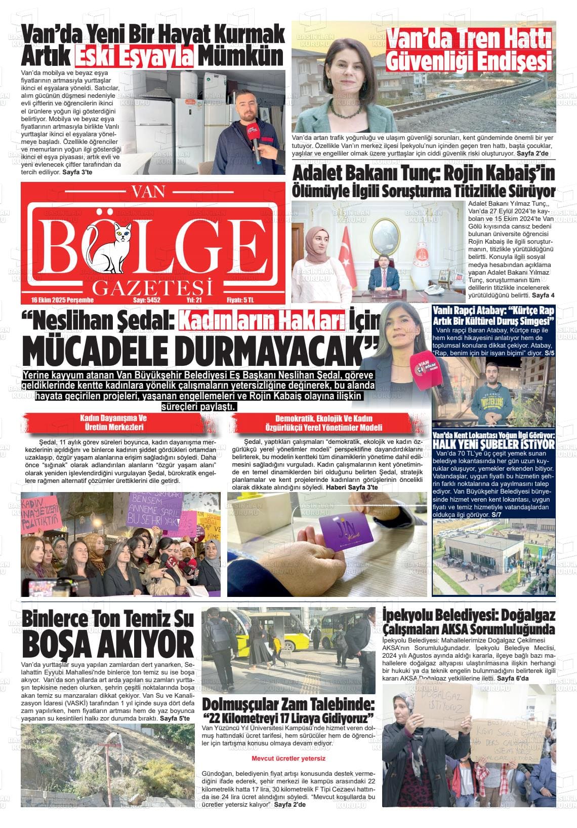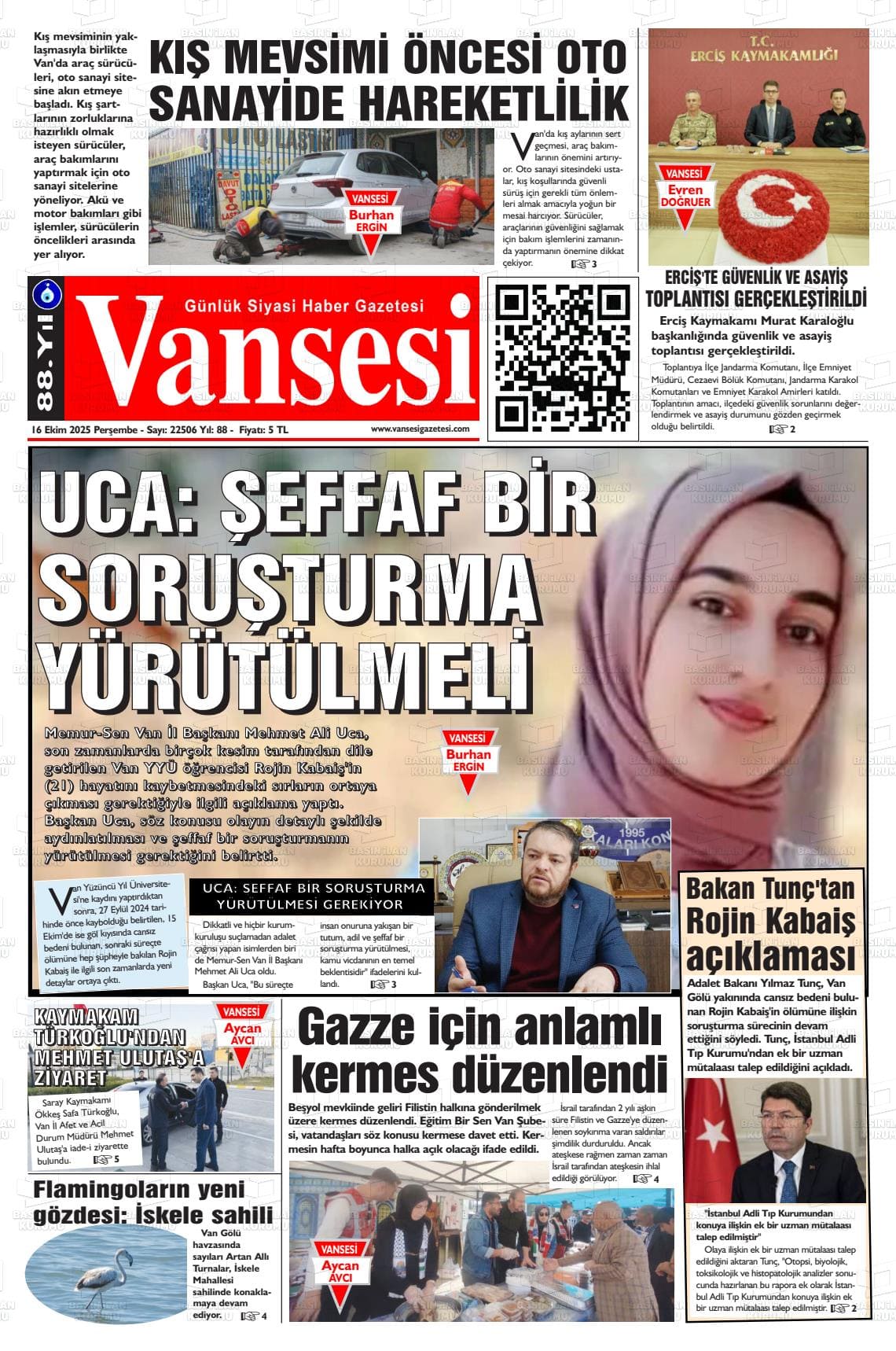 Vansesi Gazetesi’nin 16 Ekim Perşembe 2025 tarihli manşeti;