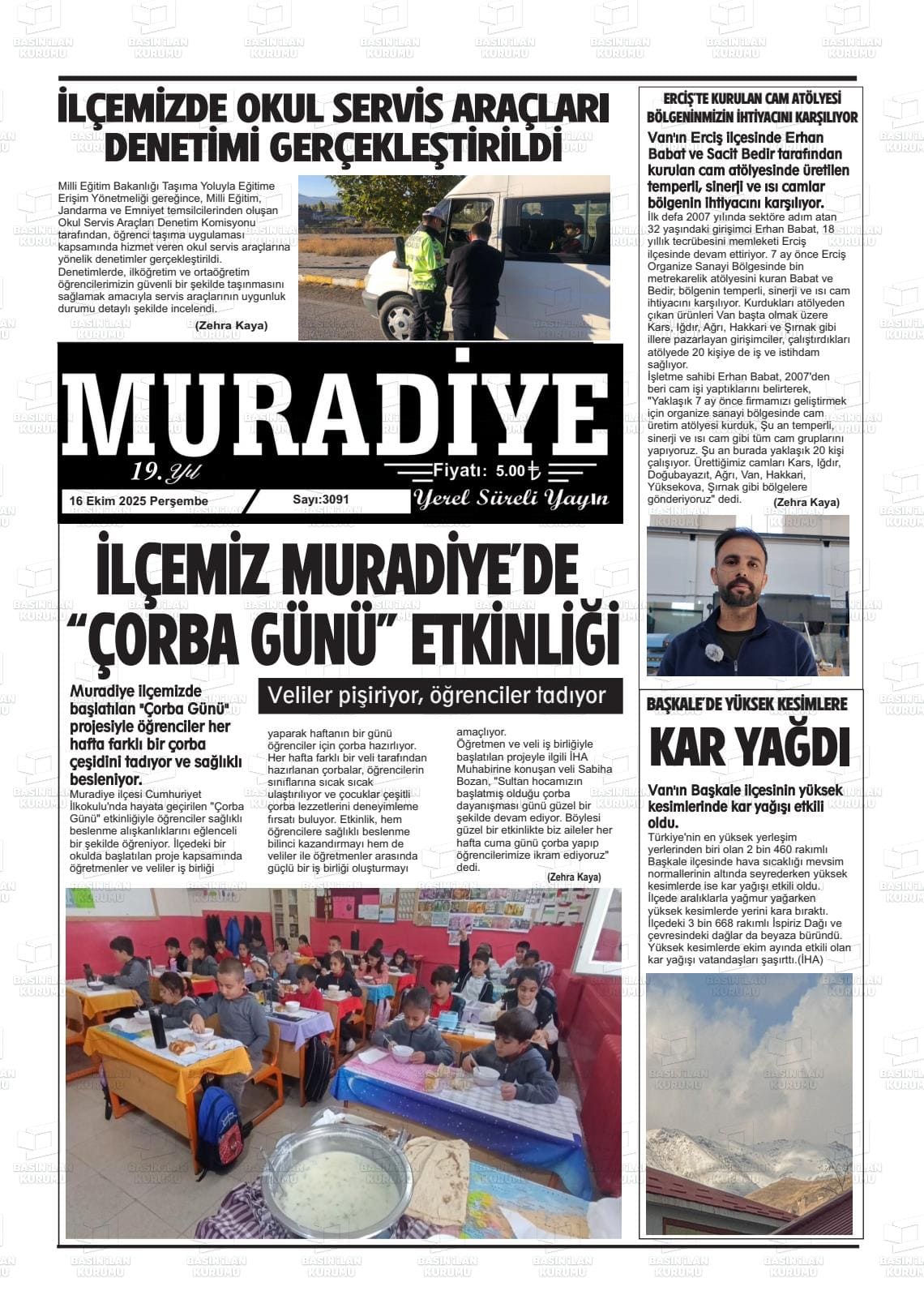 Muradiye Gazetesi’nin 16 Ekim Perşembe 2025 tarihli manşeti;