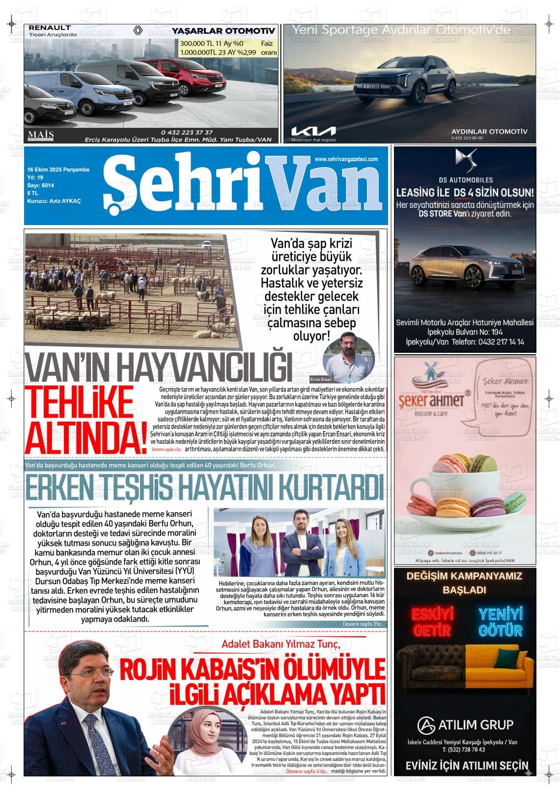 Şehrivan Gazetesi’nin 16 Ekim Perşembe 2025 tarihli manşeti;