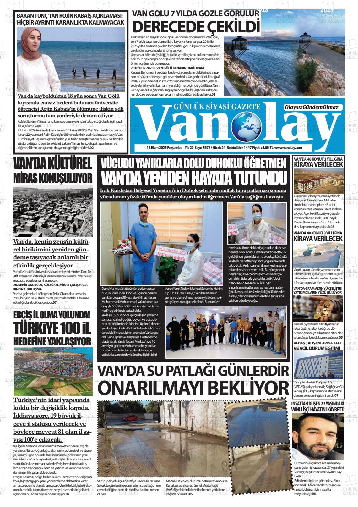 Van Olay Gazetesi’nin 16 Ekim Perşembe 2025 tarihli manşeti;