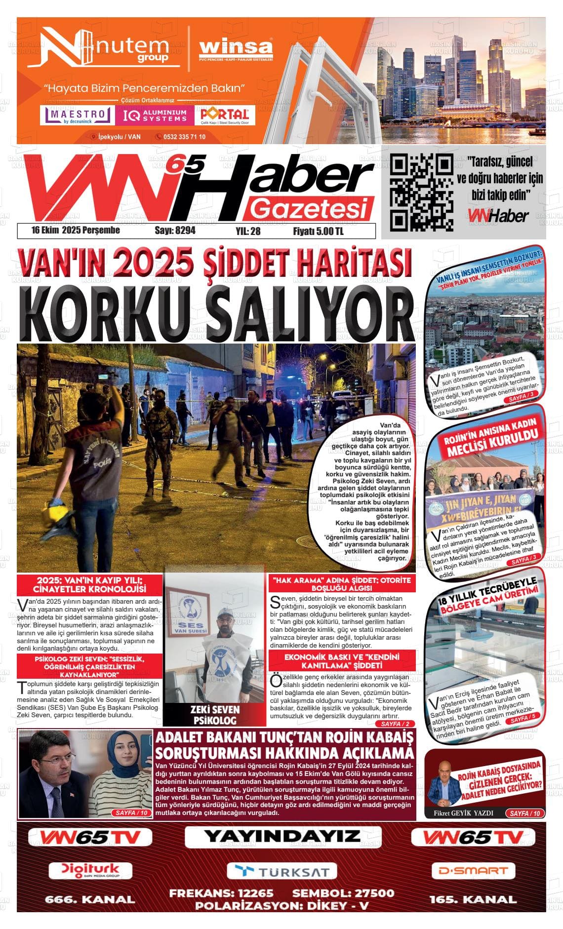 Van65 Haber Gazetesi’nin16 Ekim Perşembe 2025 tarihli manşeti;