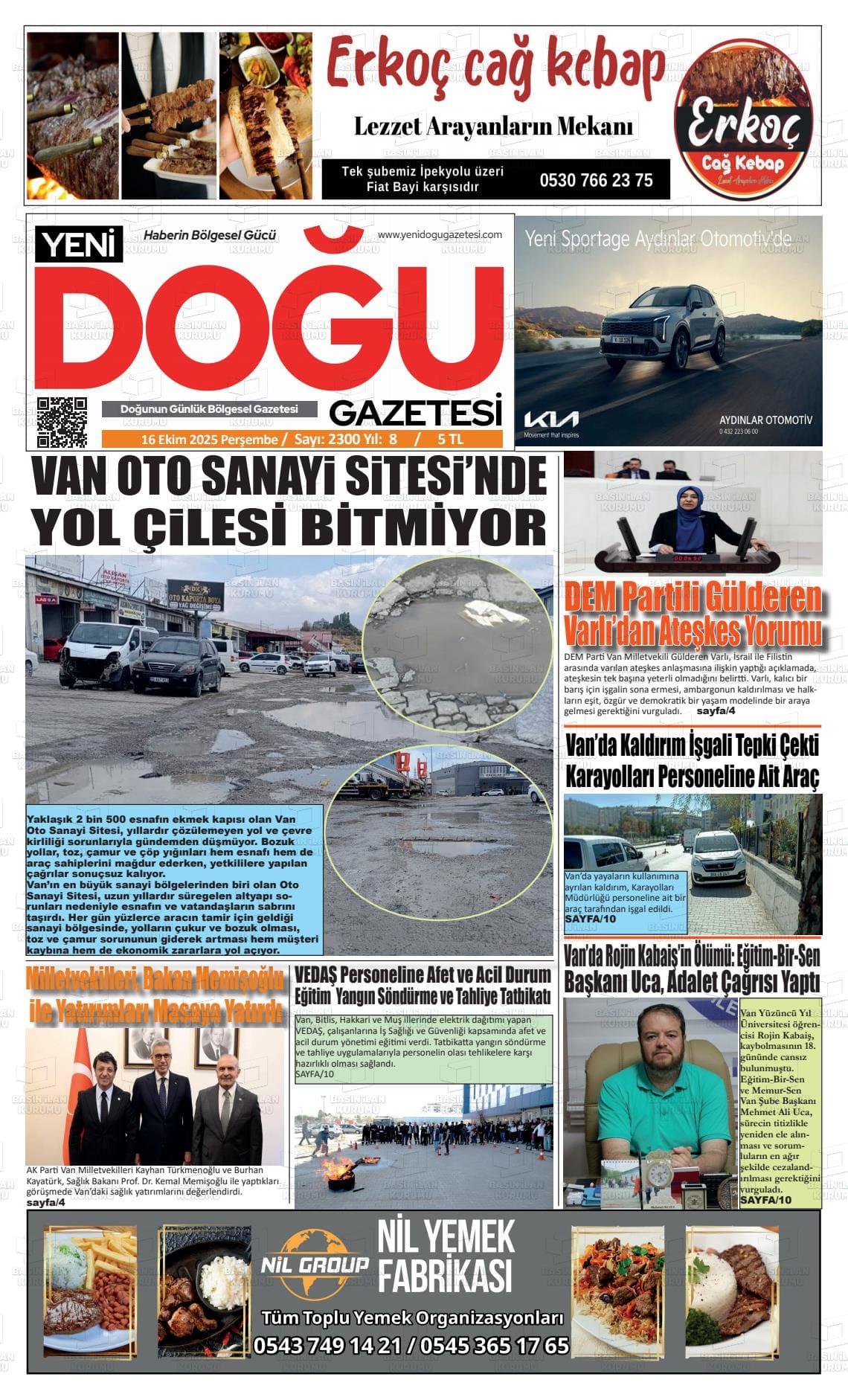 Yeni Doğu Gazetesi’nin 16 Ekim Perşembe 2025 tarihli manşeti;