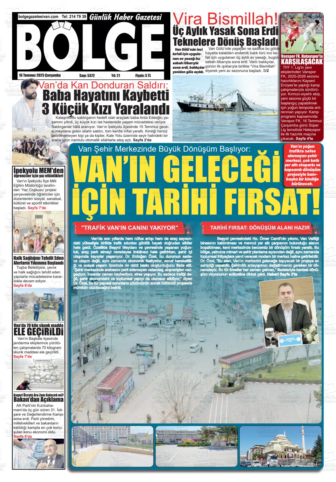 Bölge Gazetesi’nin 16 Temmuz Çarşamba 2025 tarihli manşeti;