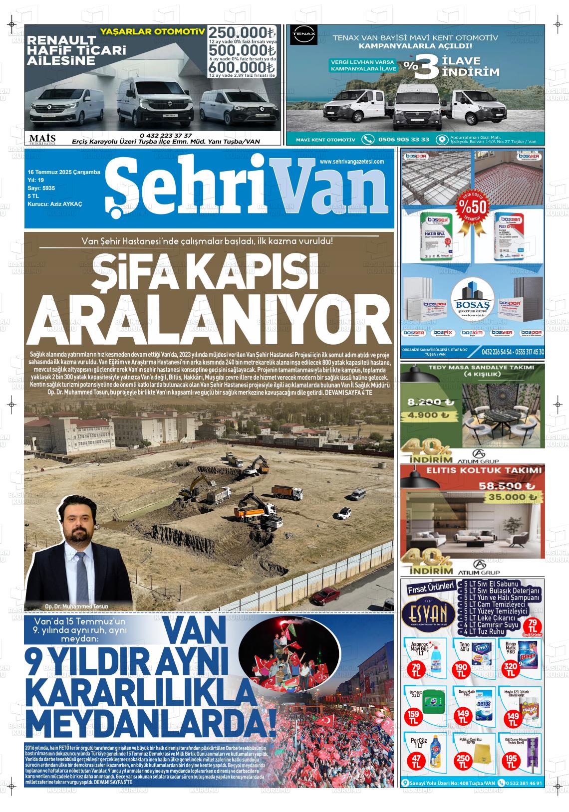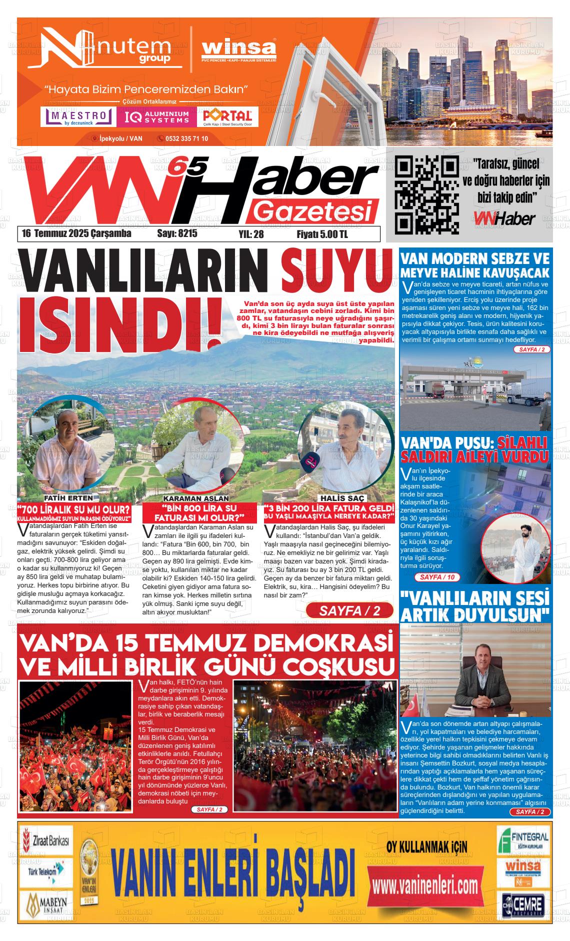 Van65 Haber Gazetesi’nin 16 Temmuz Çarşamba 2025 tarihli manşeti;