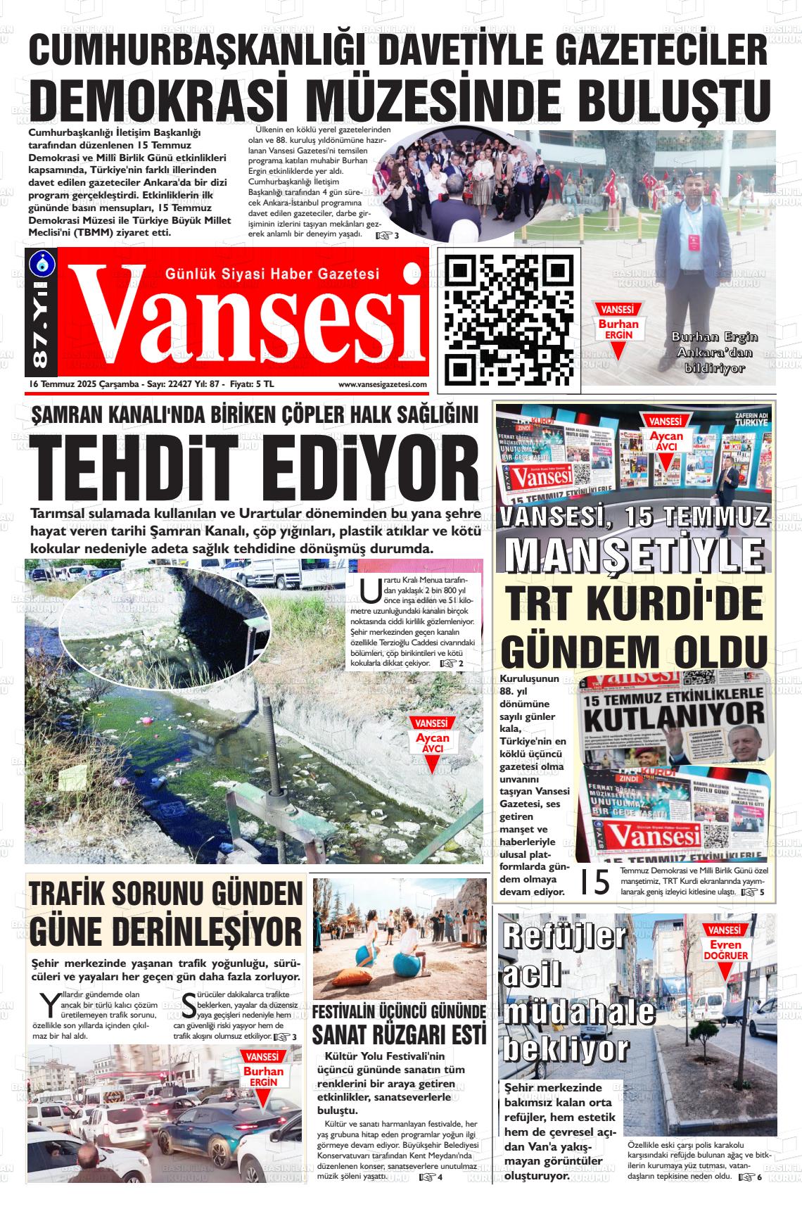 Vansesi Gazetesi’nin 16 Temmuz Çarşamba 2025 tarihli manşeti;