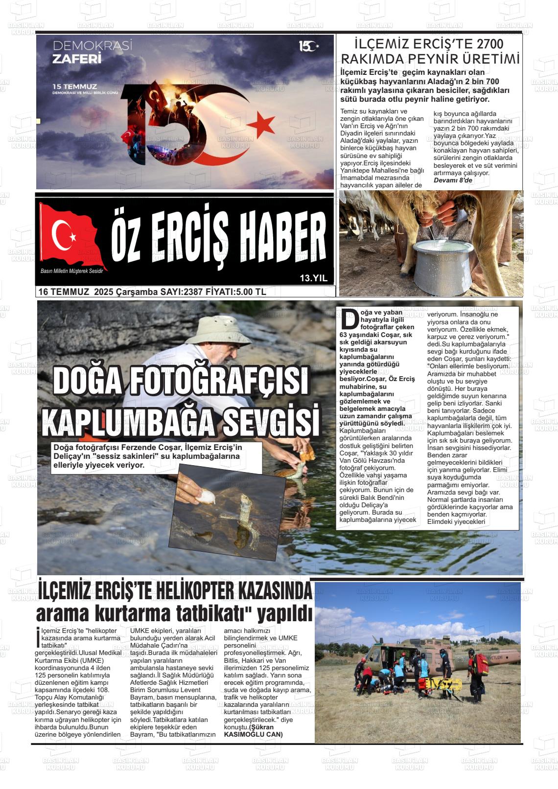 Öz Erciş Gazetesi’nin 16 Temmuz Çarşamba 2025 tarihli manşeti;