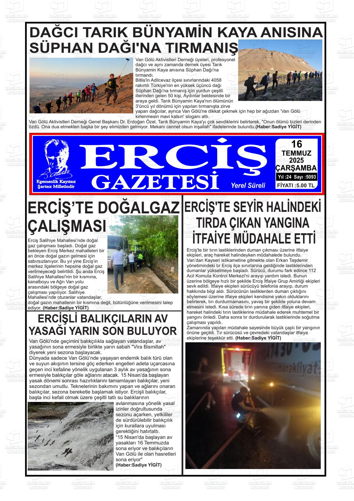 Erciş Gazetesi’nin 16 Temmuz Çarşamba 2025 tarihli manşeti;