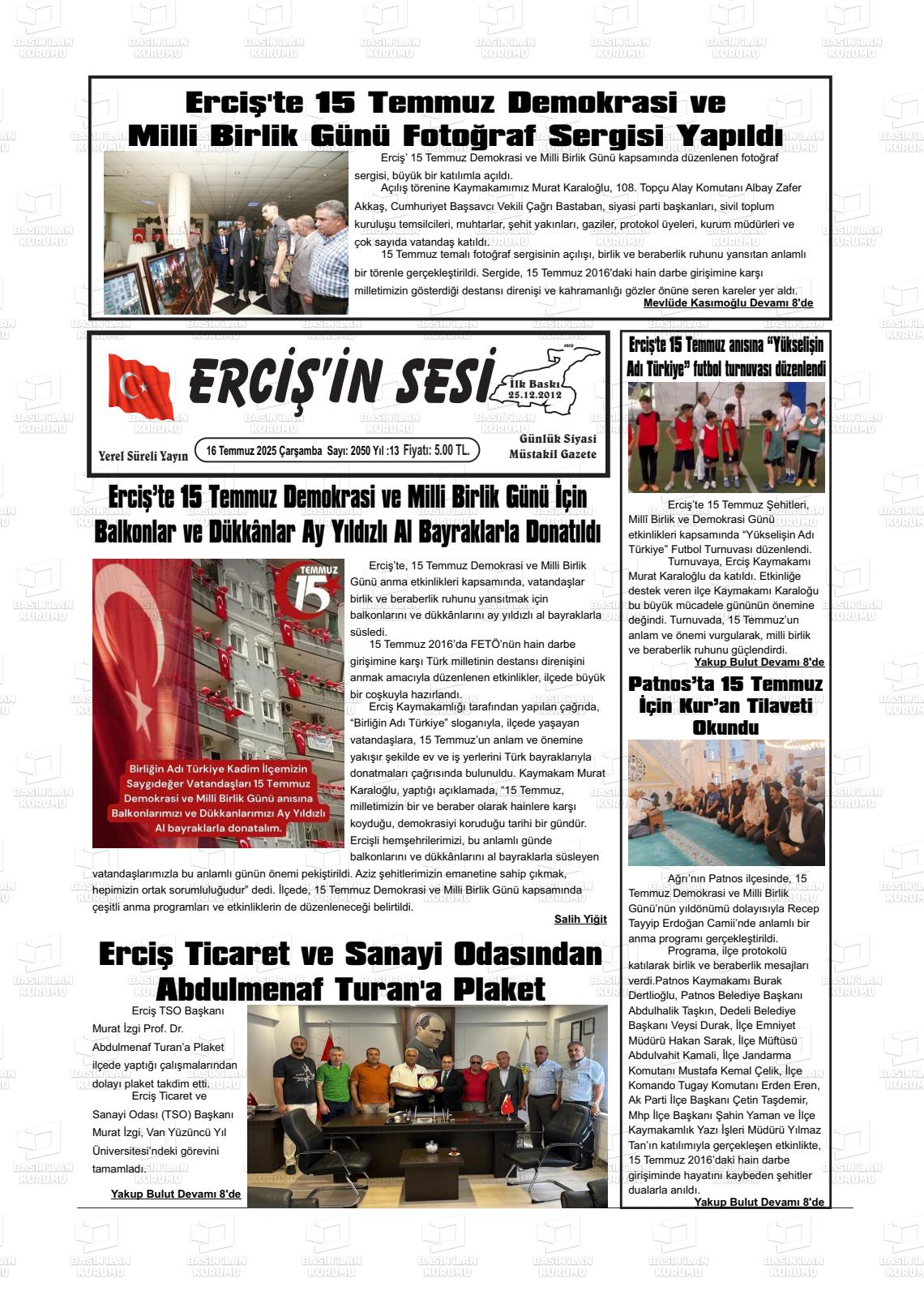 Erciş Sesi Gazetesi’nin 16 Temmuz Çarşamba 2025 tarihli manşeti;