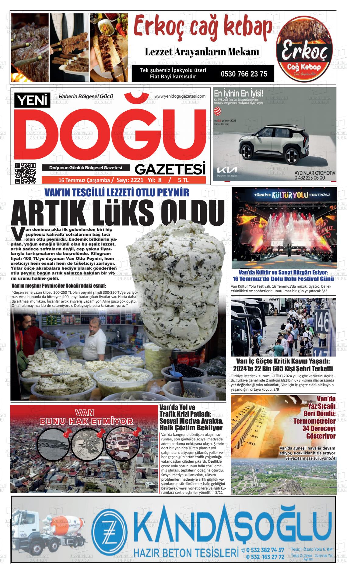 Yeni Doğu Gazetesi’nin 16 Temmuz Çarşamba 2025 tarihli manşeti;
