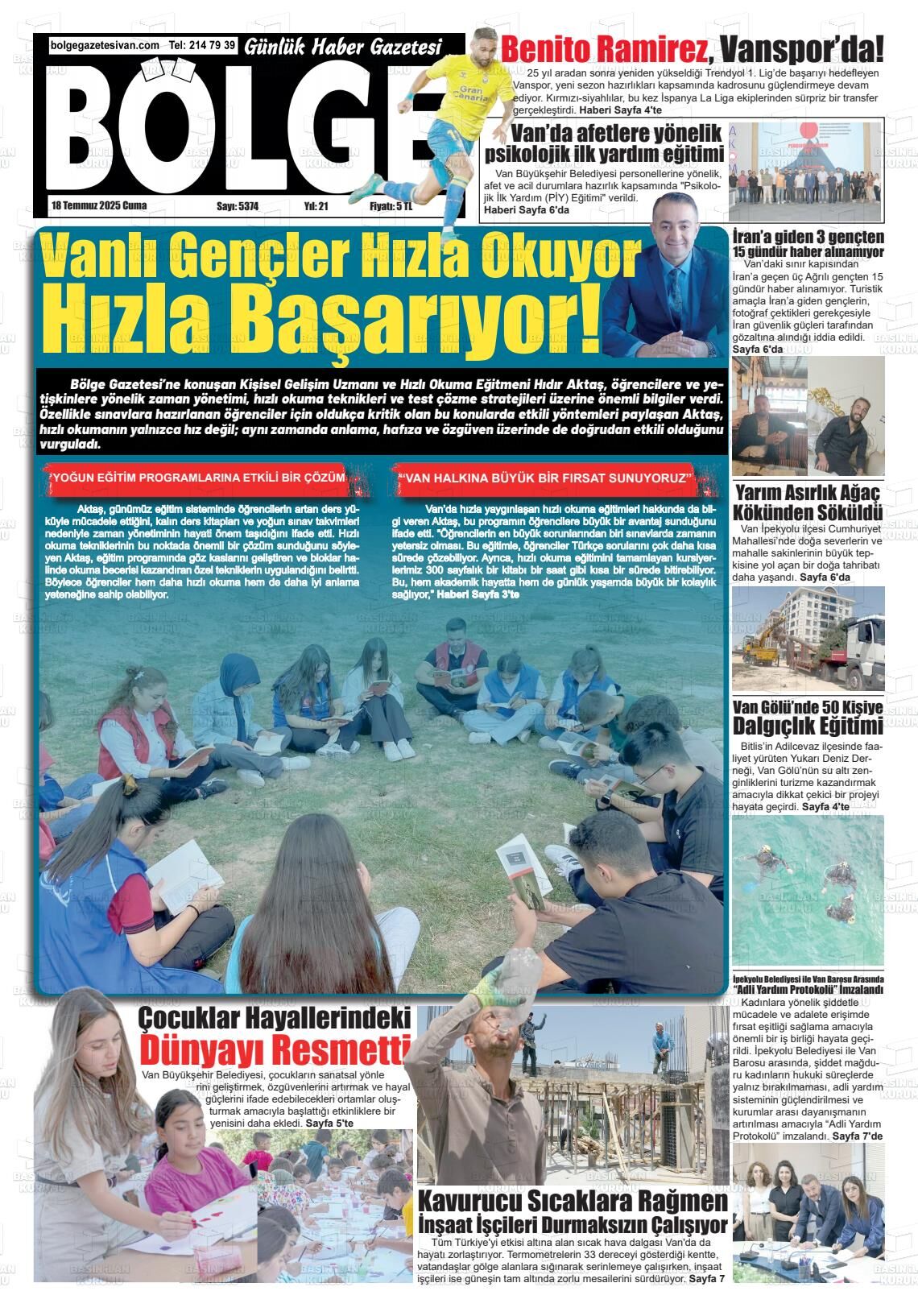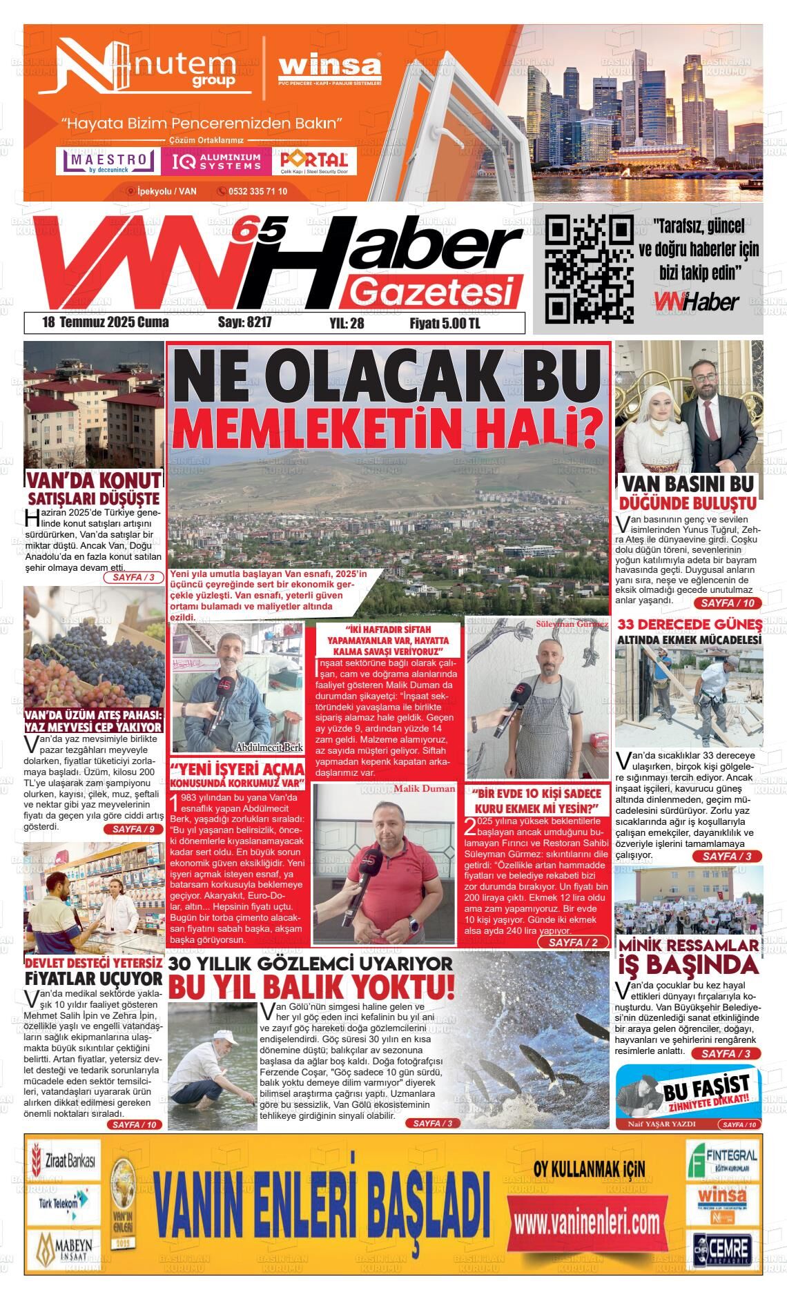 Van65 Haber Gazetesi’nin 18 Temmuz Cuma 2025 tarihli manşeti;