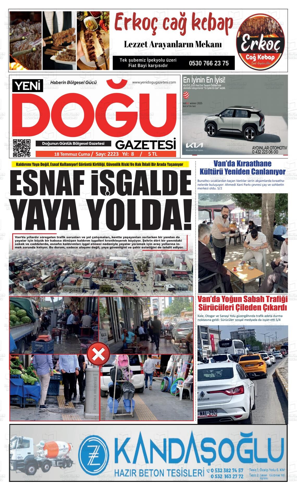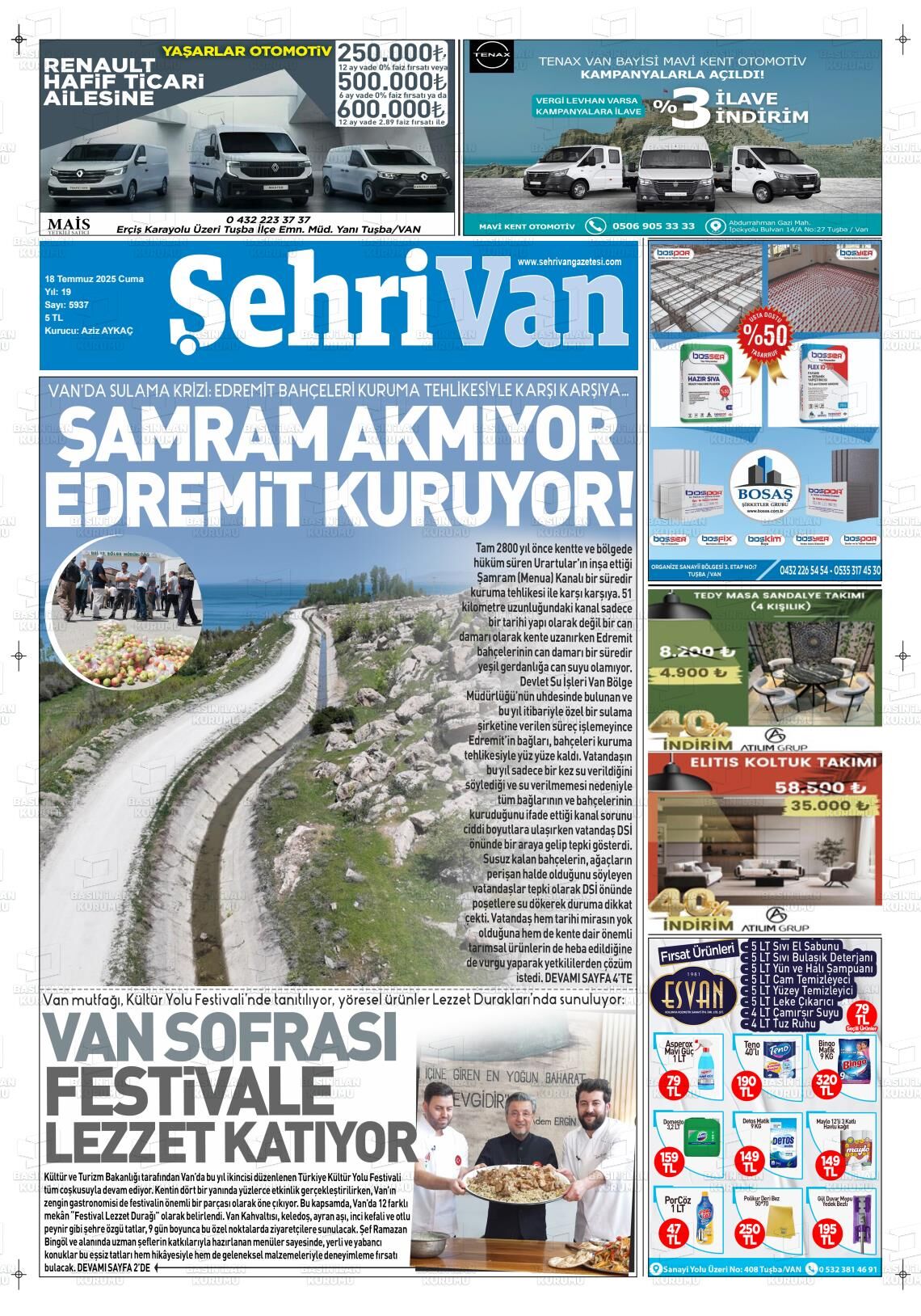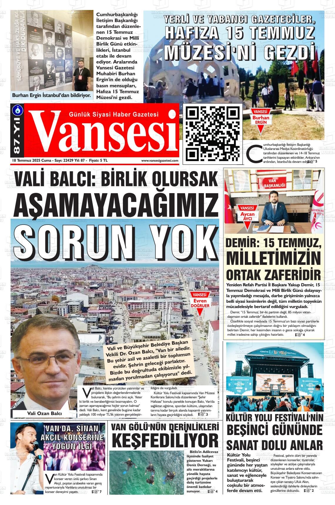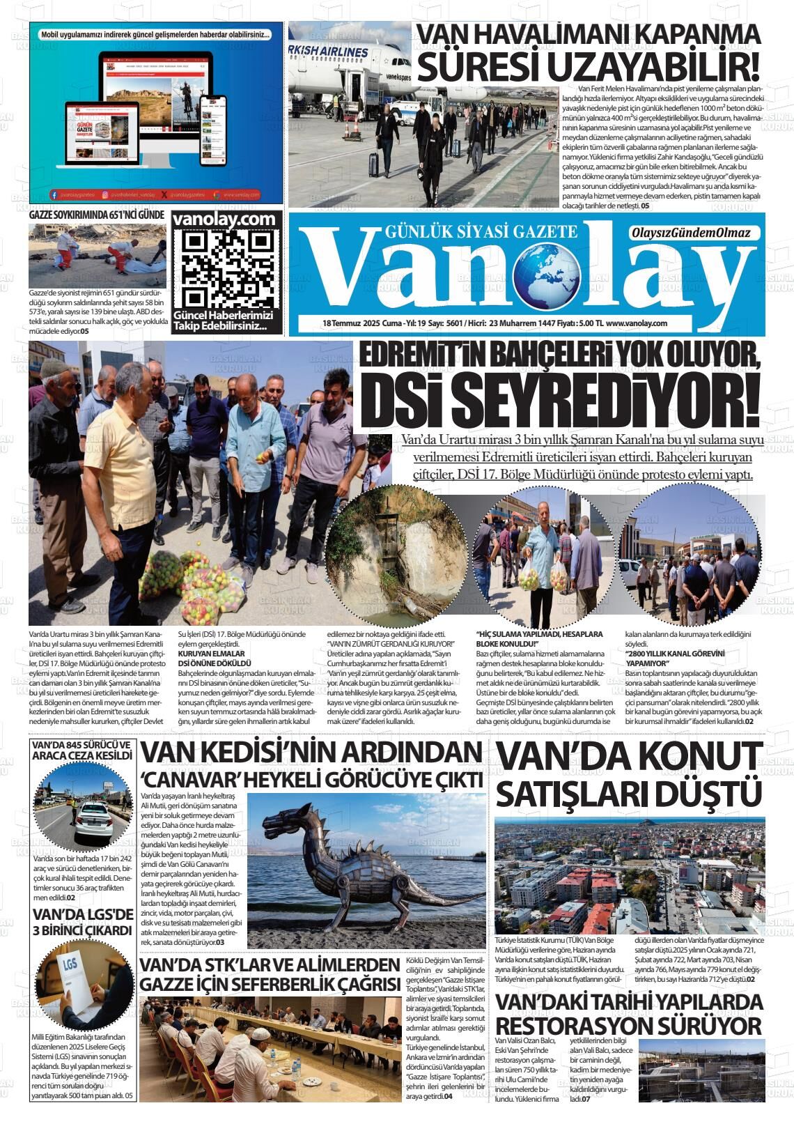 Van Olay Gazetesi’nin 18 Temmuz Cuma 2025 tarihli manşeti;