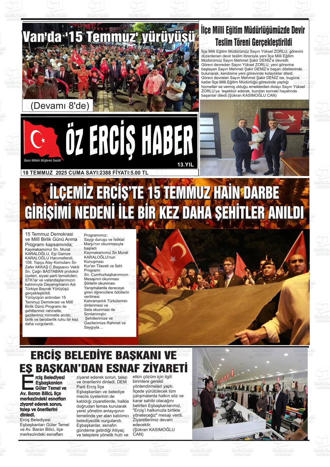 Öz Erciş Gazetesi’nin 18 Temmuz Cuma 2025 tarihli manşeti;
