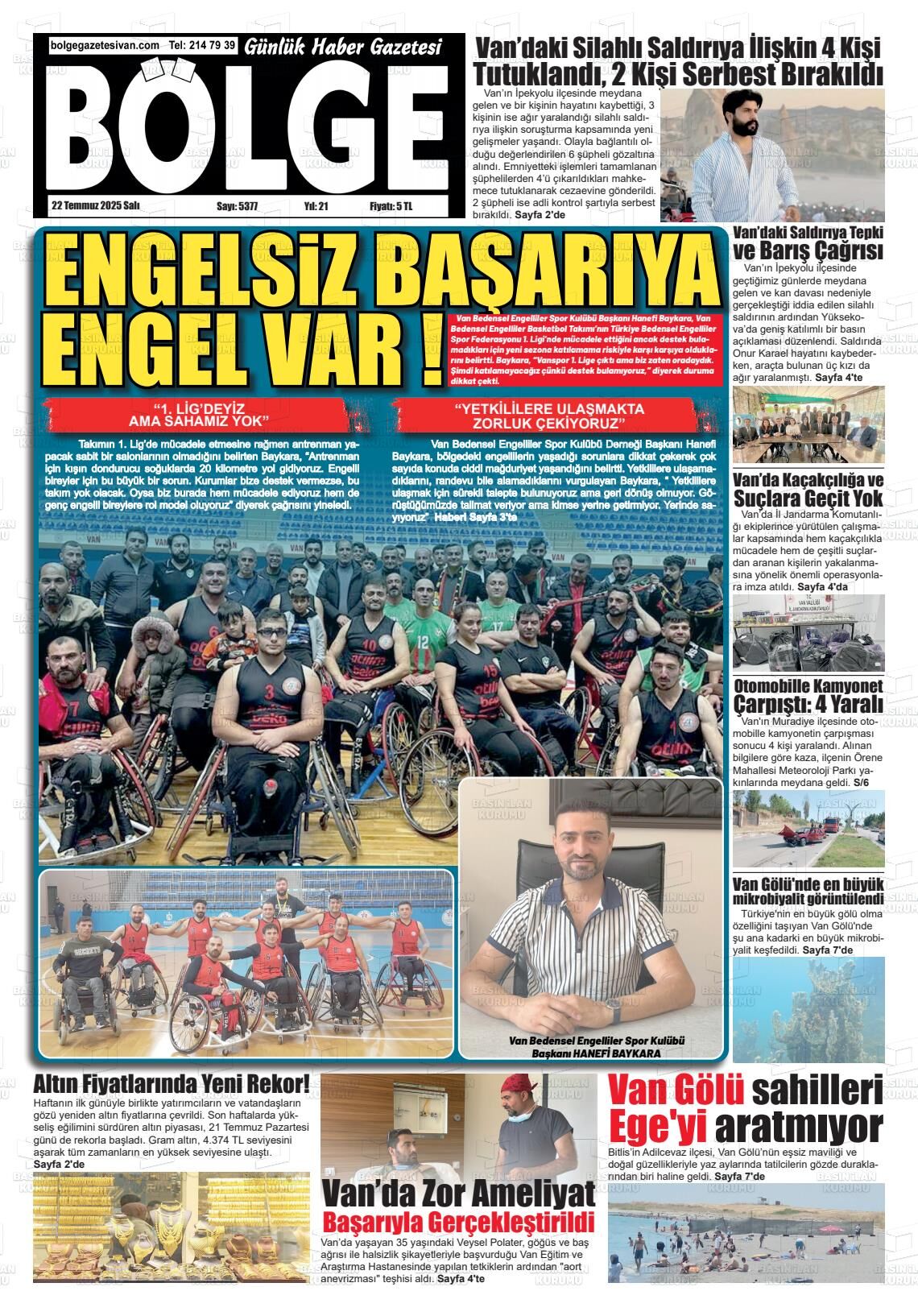 Van Olay Gazetesi’nin 22 Temmuz Salı 2025 tarihli manşeti;